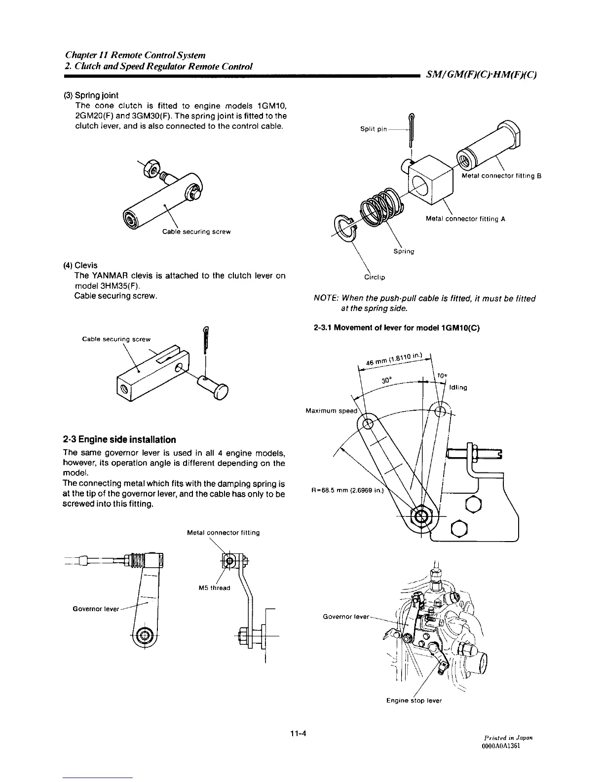 Yanmar 3GM30C - Engine Side Installation; Movement of Lever for Model 1 GM10(C)