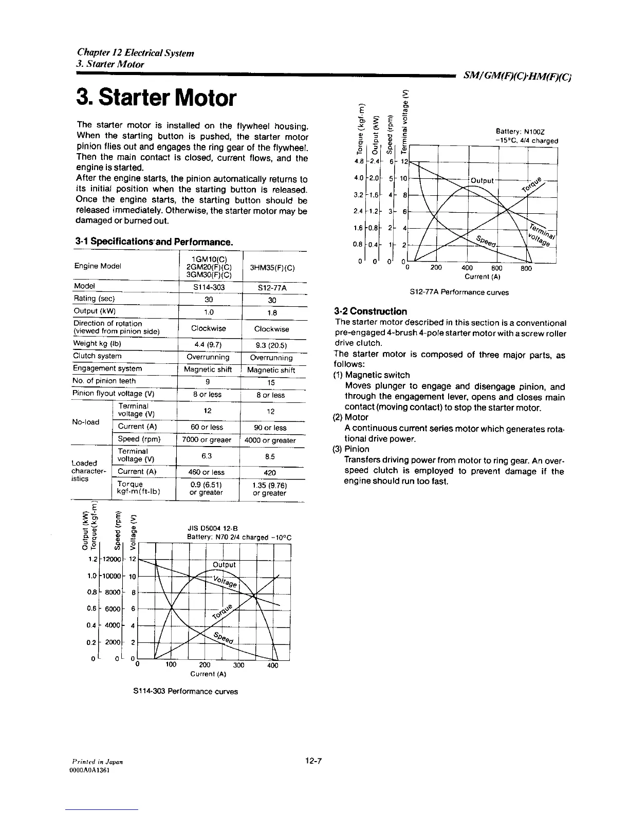 Yanmar 3GM30C - Starter Motor Specifications and Performance; Starter Motor Construction
