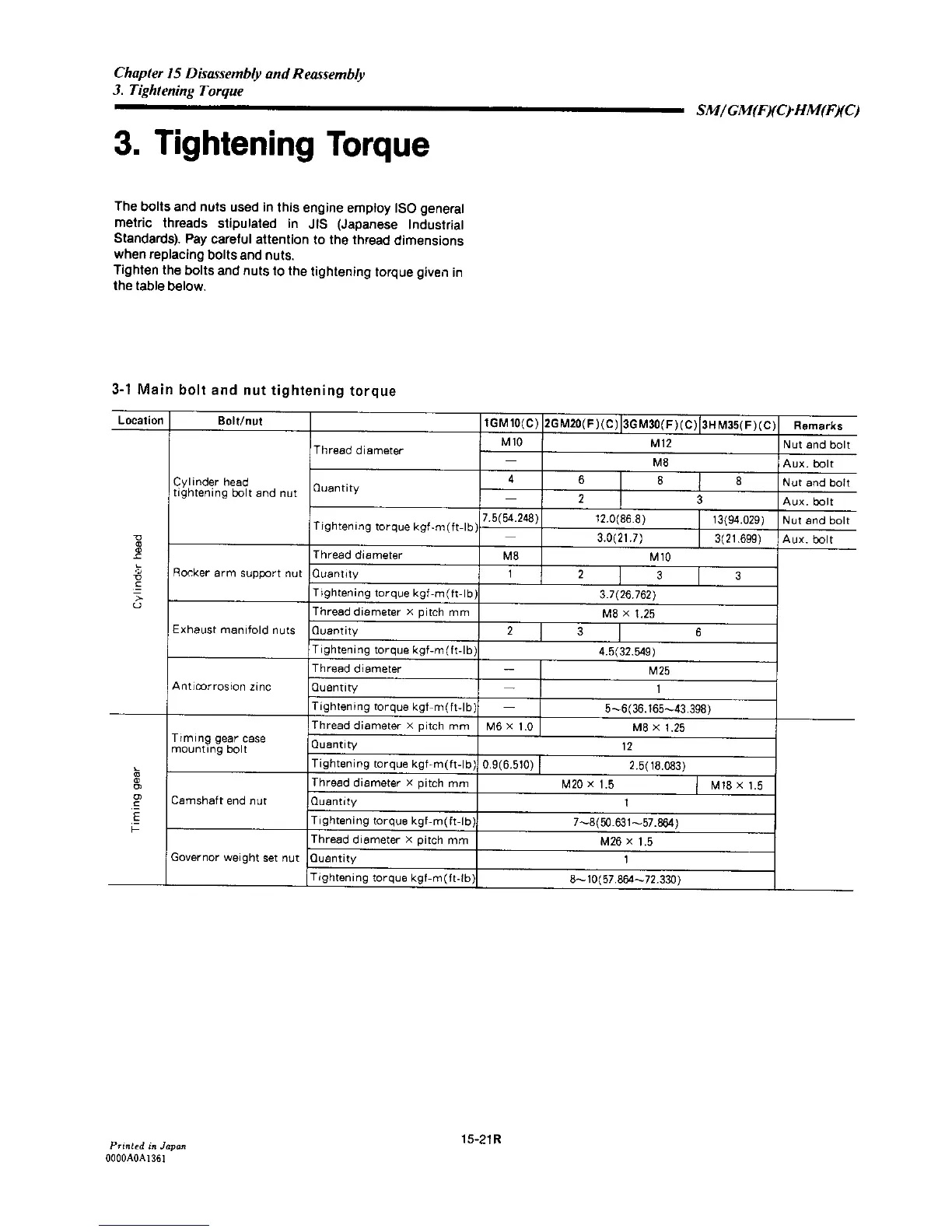 Yanmar 3GM30C - Main Bolt and Nut Tightening Torque