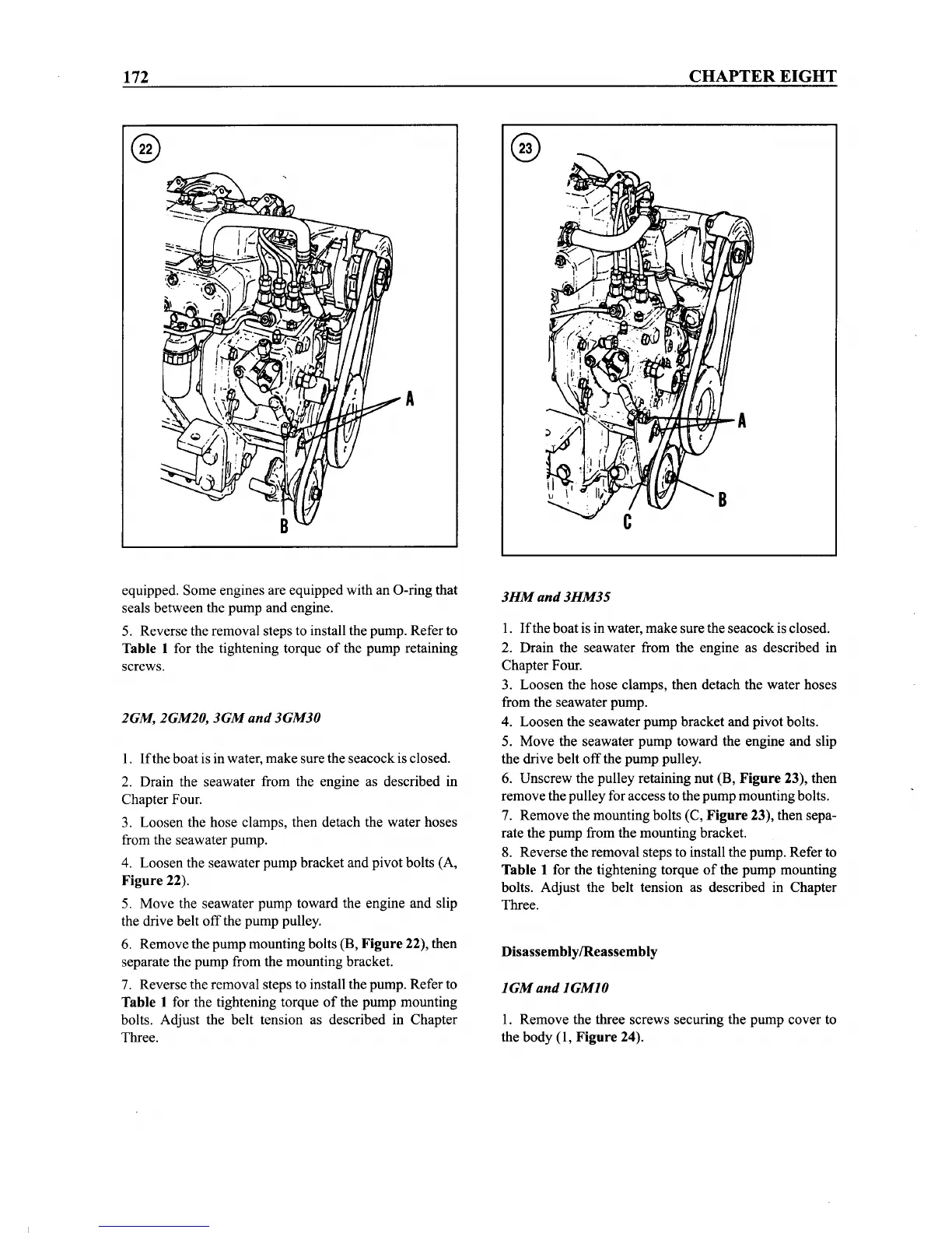 4. Loosen the seawater pump bracket and pivot bolts (A,