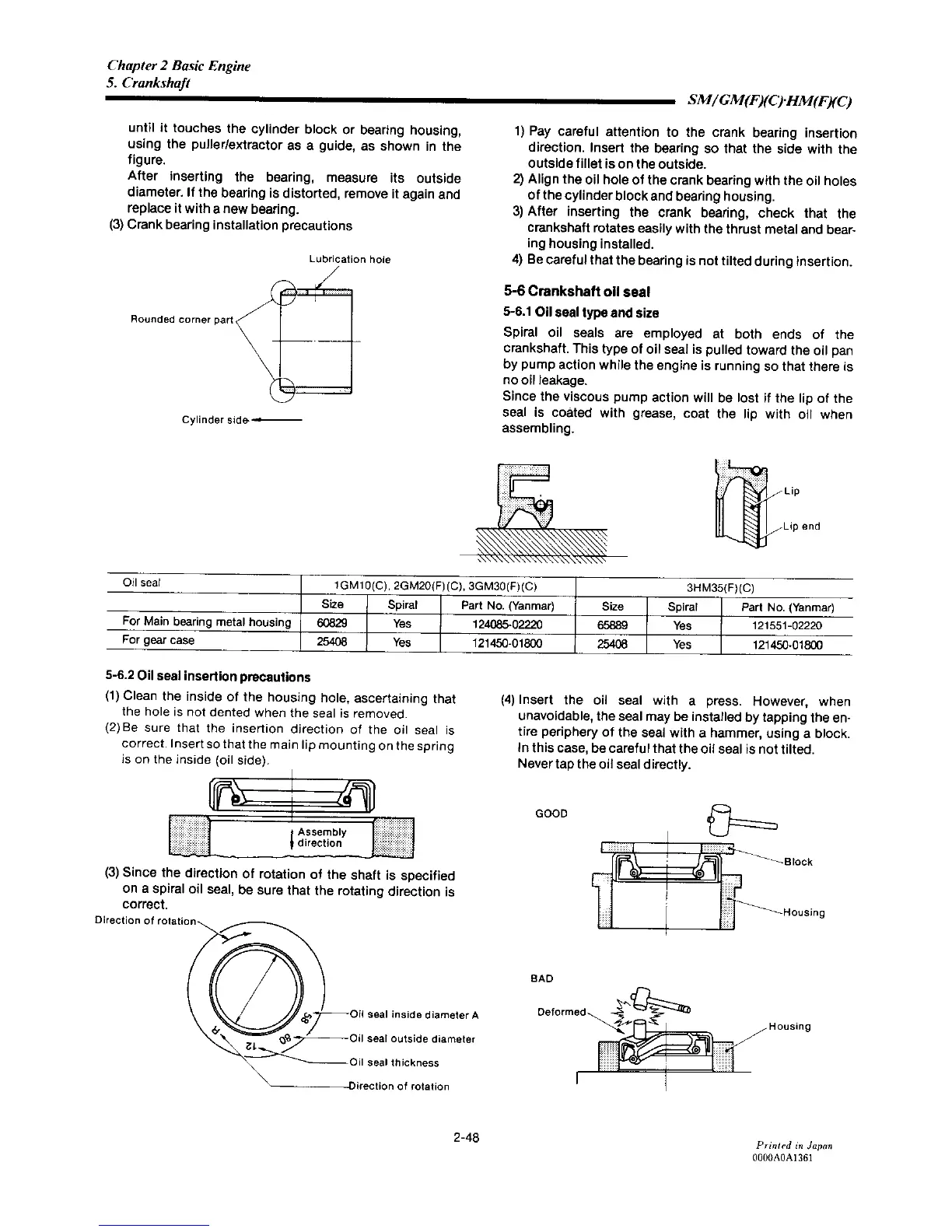 Yanmar 3HM35F - Crankshaft Oil Seal; Oil Seal Insertion Precautions; Oil Seal Type and Size