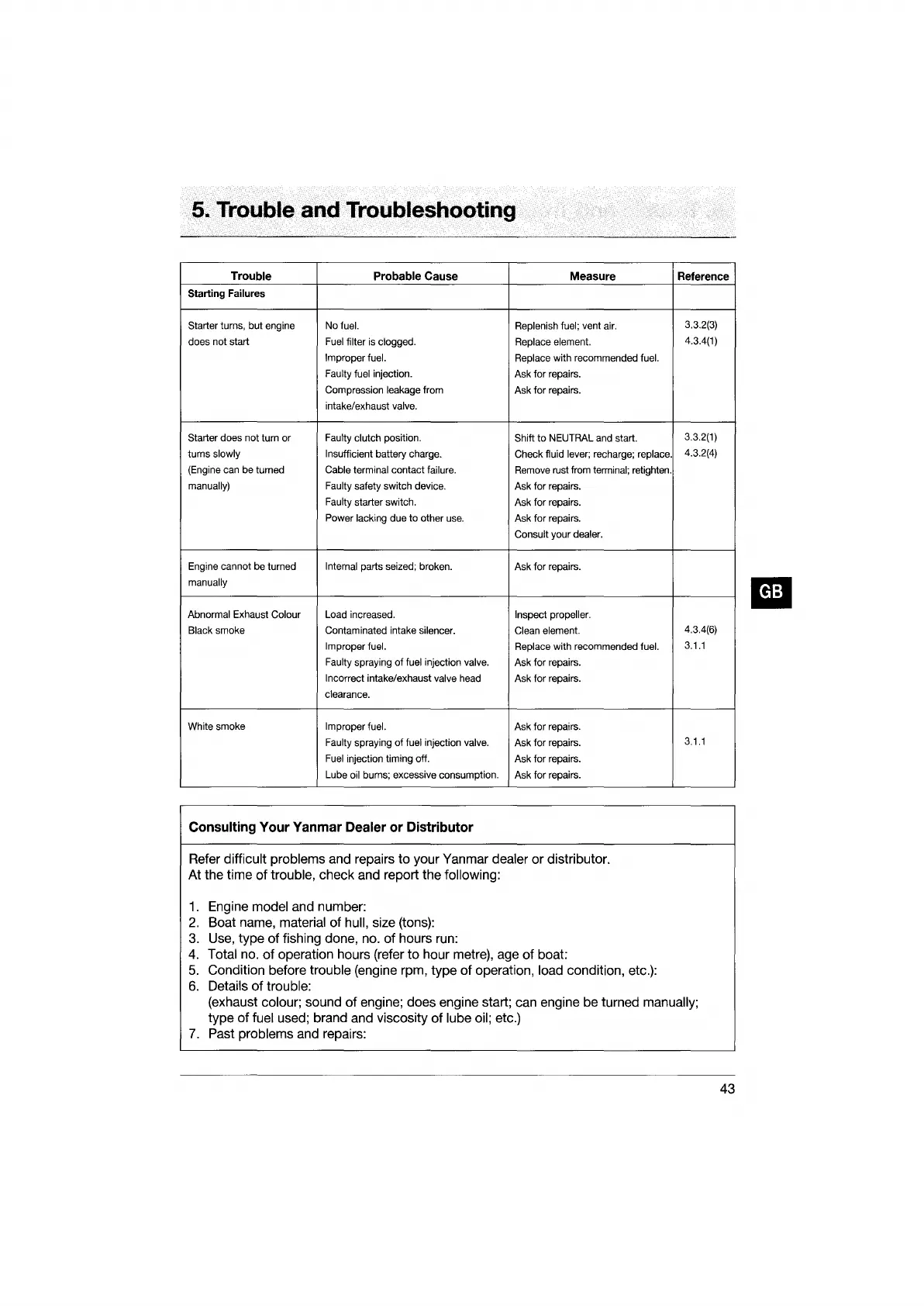 Refer difficult problems and repairs to your Yanmar dealer or distributor.