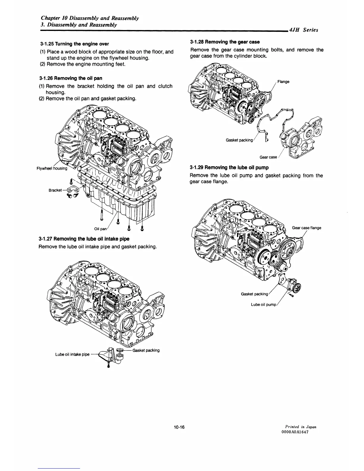 Yanmar 4JH-DTE - Disassembly: Turning the Engine over; Disassembly: Removing the Oil Pan; Disassembly: Removing the Gear Case; Disassembly: Removing the Lube Oil Pump