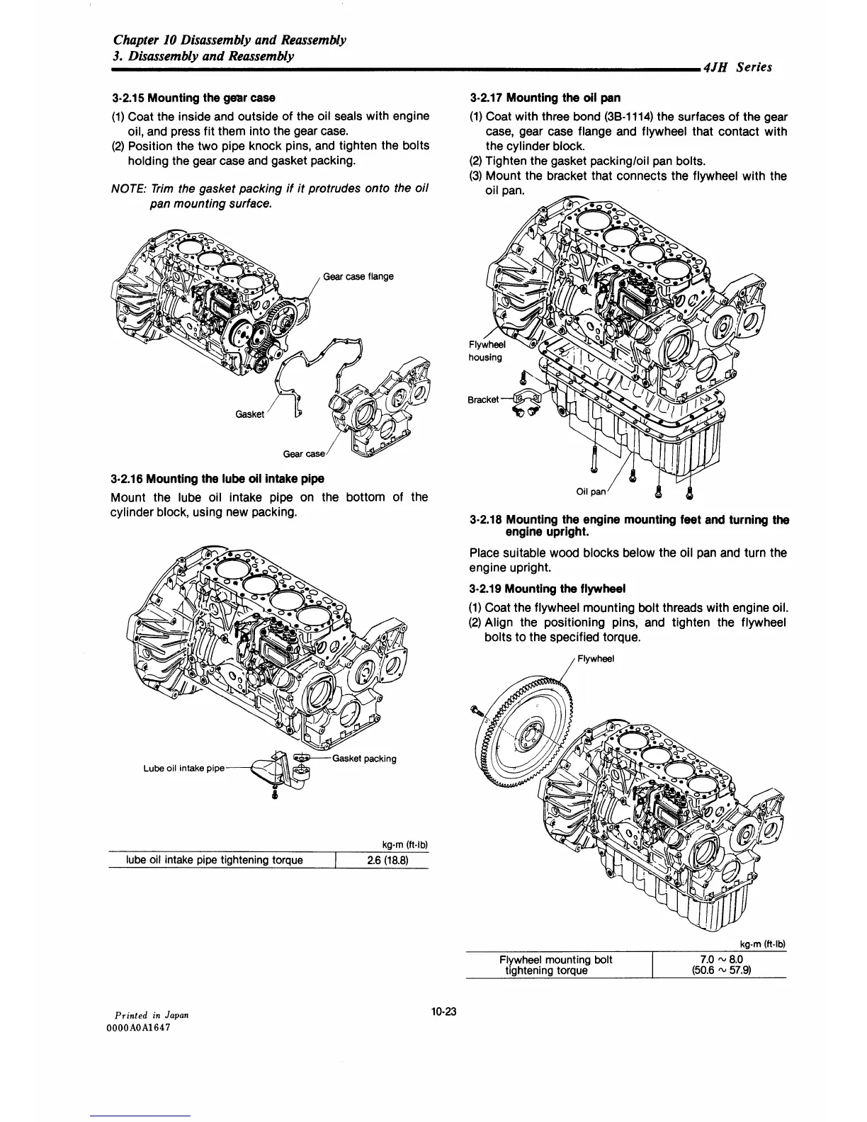Yanmar 4JH-DTE - Reassembly: Mounting the Gear Case; Reassembly: Mounting the Oil Pan; Reassembly: Mounting the Lube Oil Intake Pipe
