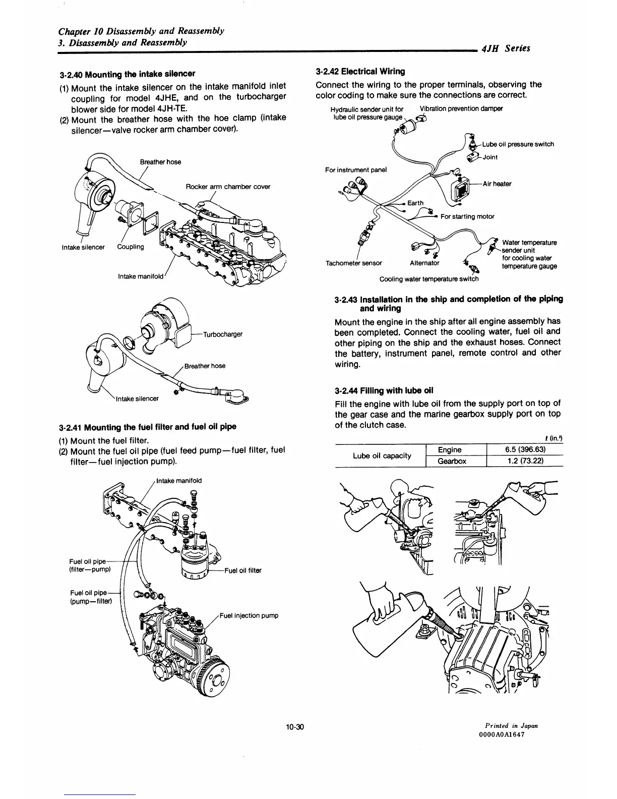 Yanmar 4JH-DTE - Reassembly: Mounting the Intake Silencer; Reassembly: Electrical Wiring; Reassembly: Mounting the Fuel Filter and Fuel Oil Pipe; Reassembly: Filling with Lube Oil