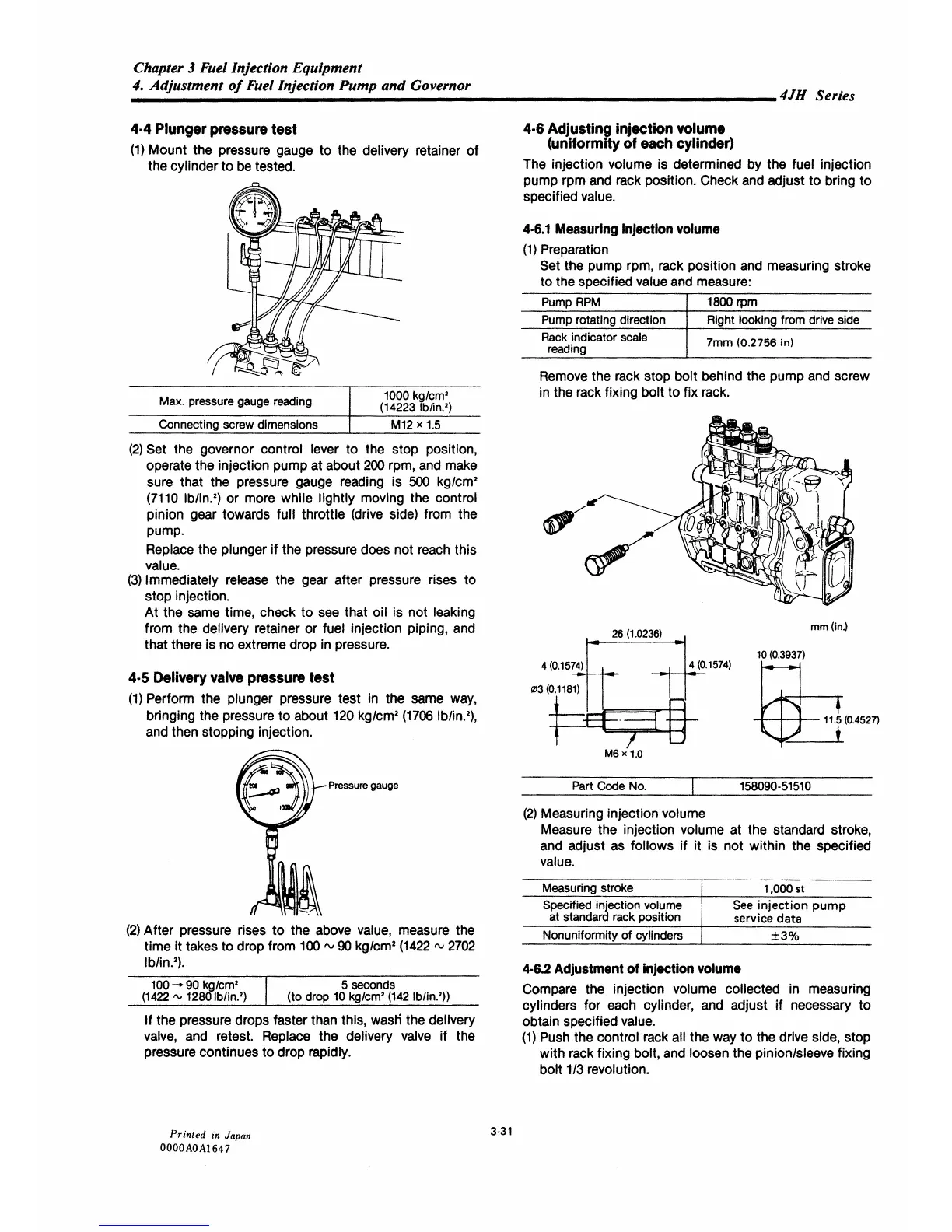 Yanmar 4JH-DTE - Plunger Pressure Test; Delivery Valve Pressure Test; Adjusting Injection Volume (Unifomity of each Cylinder)