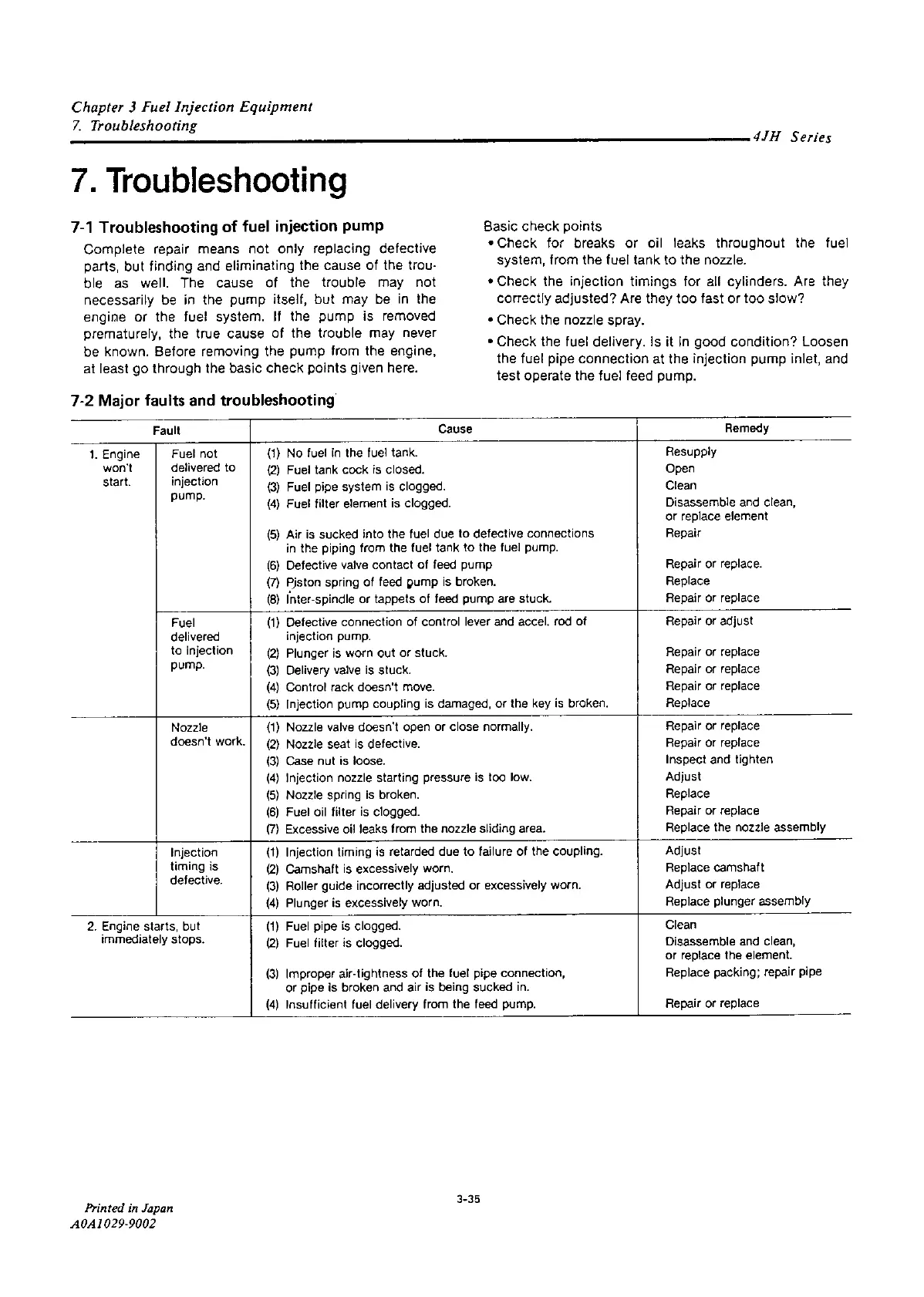 Yanmar 4JH2-DTE - Troubleshooting of Fuel Injection Pump; Major Faults and Troubleshooting