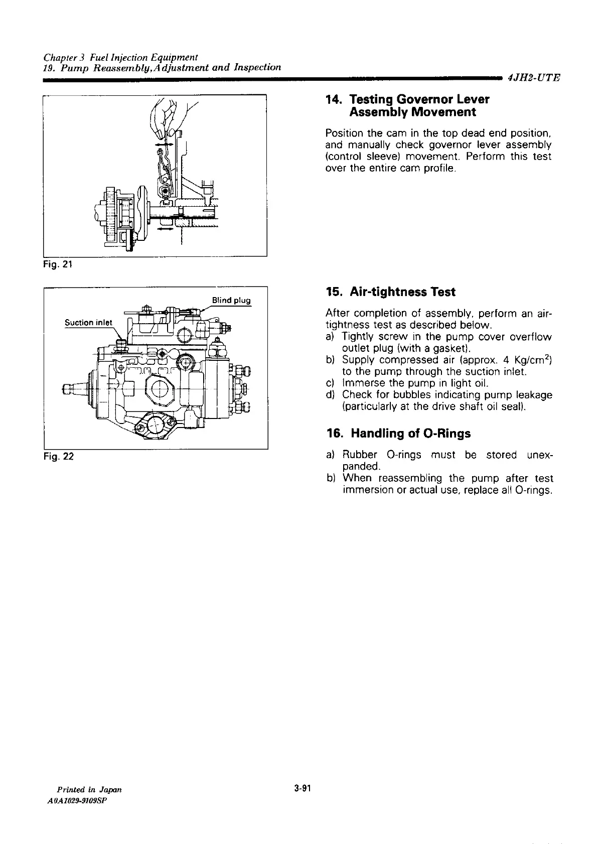 Yanmar 4JH2-DTE - Testing Governor Lever Assembly Movement; Air-Tightness Test; Handling of O-Rings