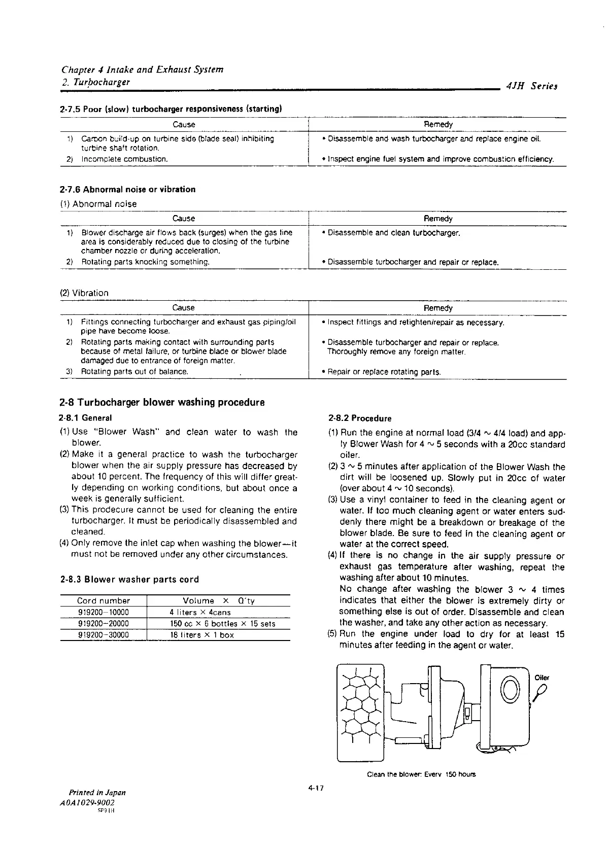 Yanmar 4JH2-DTE - Turbocharger Blower Washing Procedure; Poor (Slow) Turbocharger Responsiveness (Starting); Abnormal Noise or Vibration; Blower Washer Parts Cord