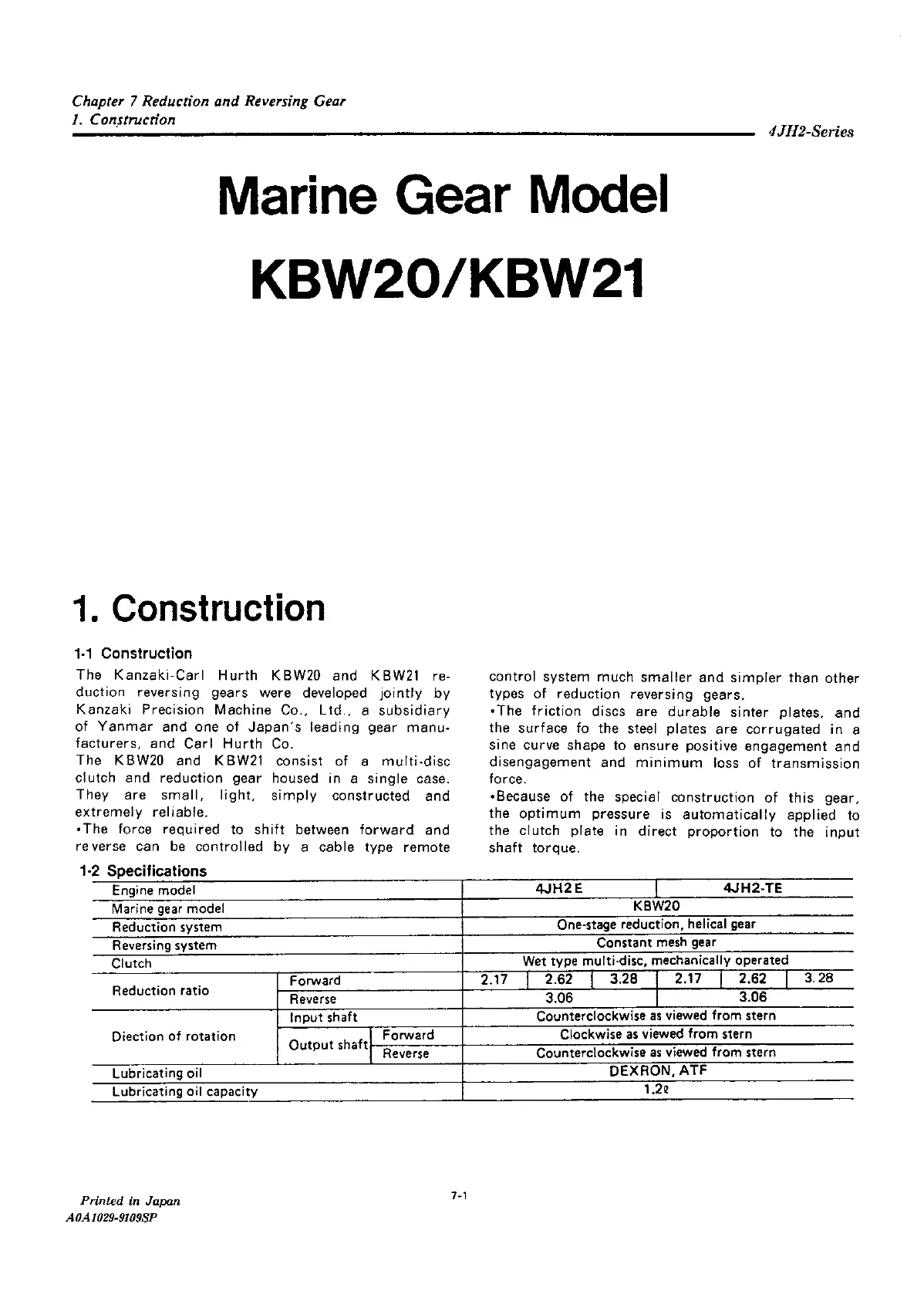 Yanmar 4JH2-DTE - Marine Gear Model KBW20;21 Construction;Specifications