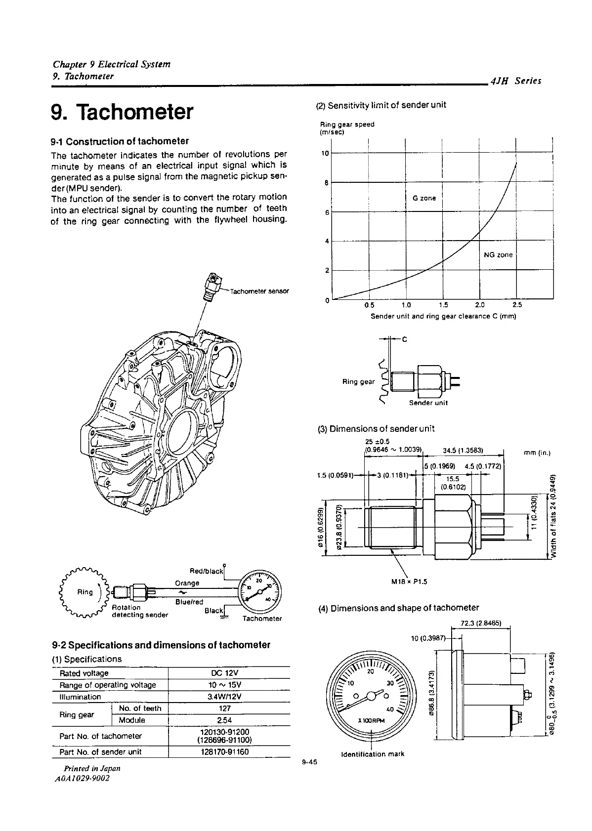 Yanmar 4JH2-DTE - Construction of Tachometer; Specifications and Dimensions of Tachometer
