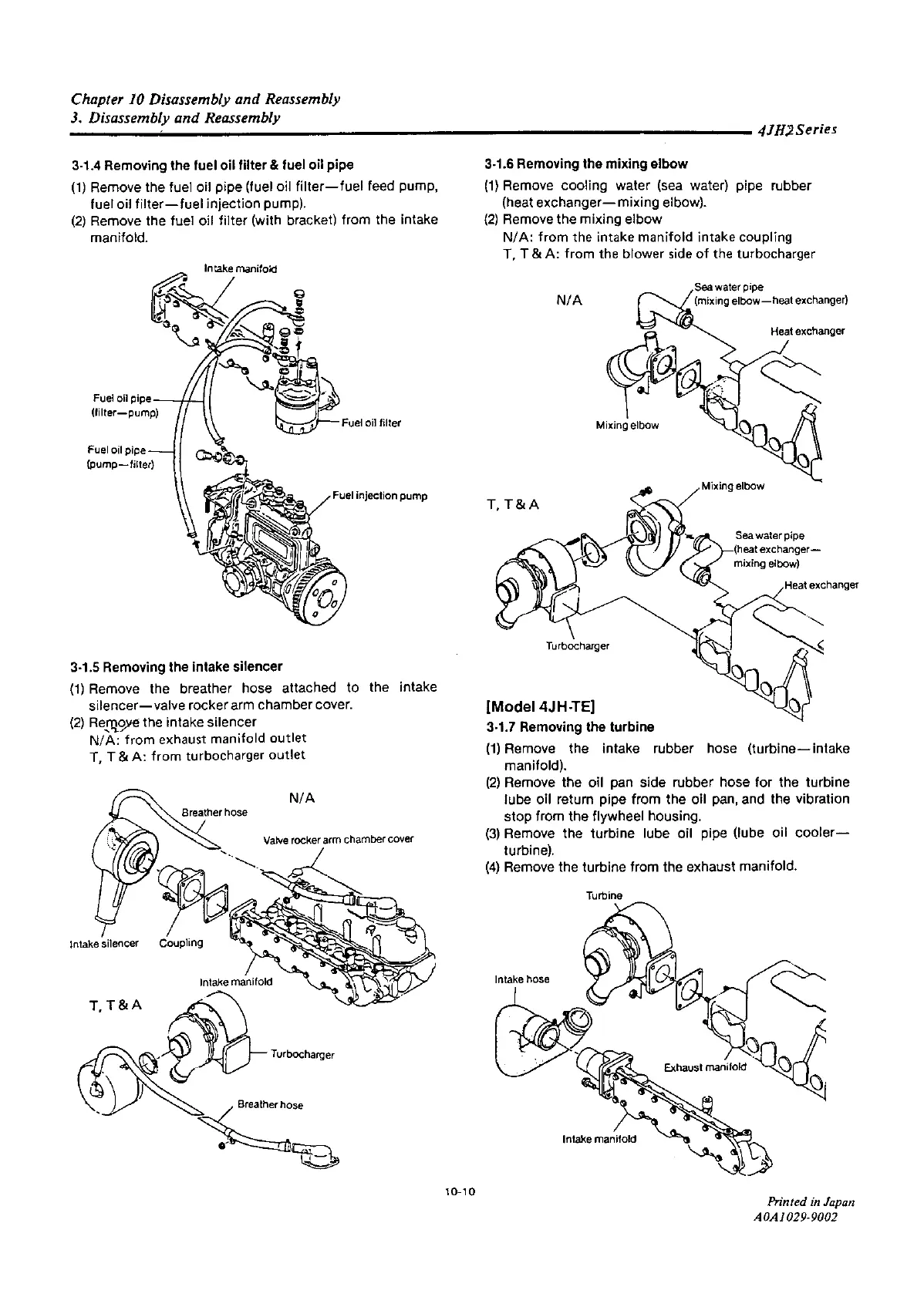 Yanmar 4JH2-DTE - Removing the Fuel Oil Filter and Fuel Oil Pipe; Removing the Intake Silencer; Removing the Mixing Elbow; Removing the Turbine