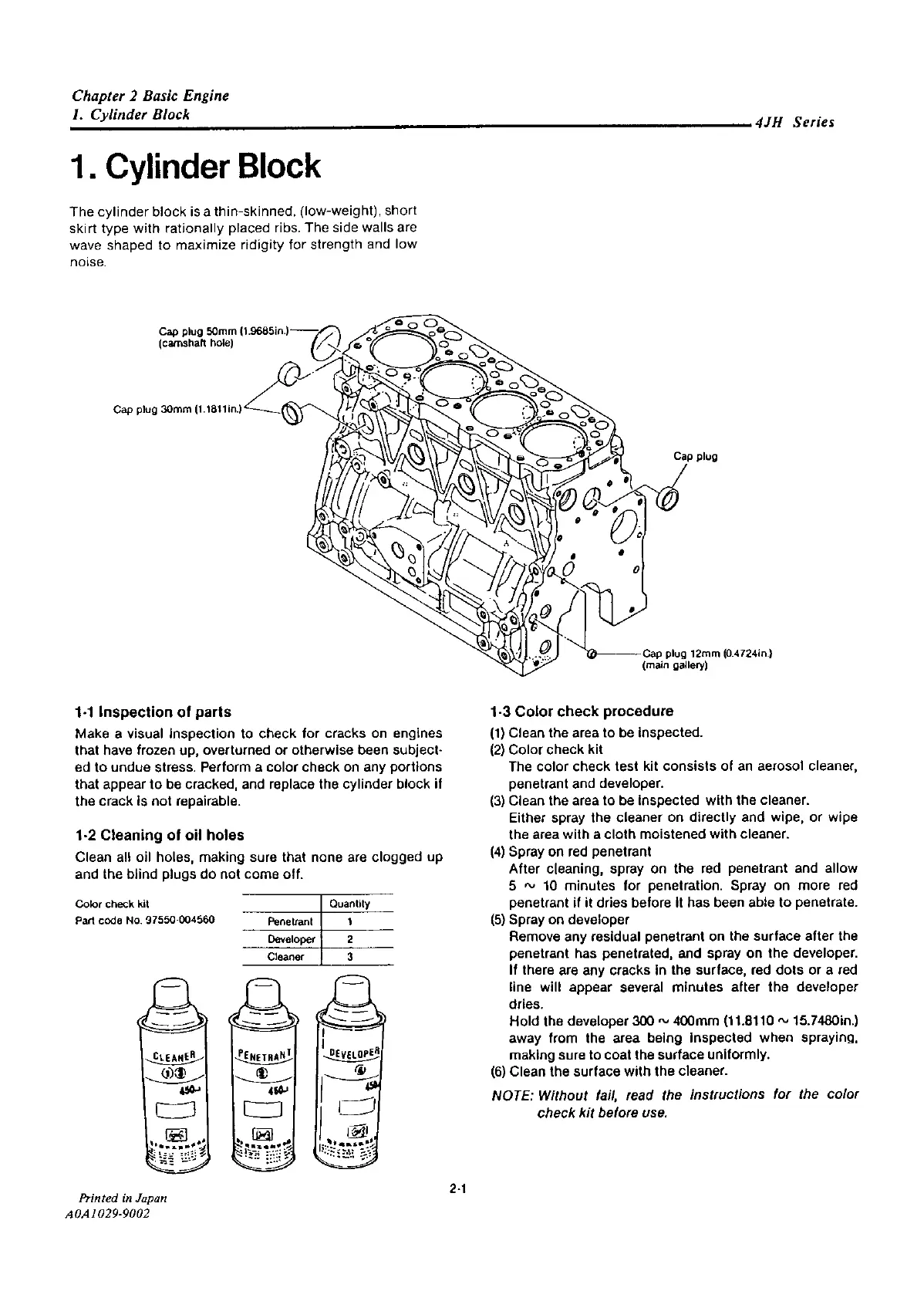 Yanmar 4JH2-TE - Cylinder Block; Inspection of Parts; Cleaning of Oil Holes; Color Check Procedure