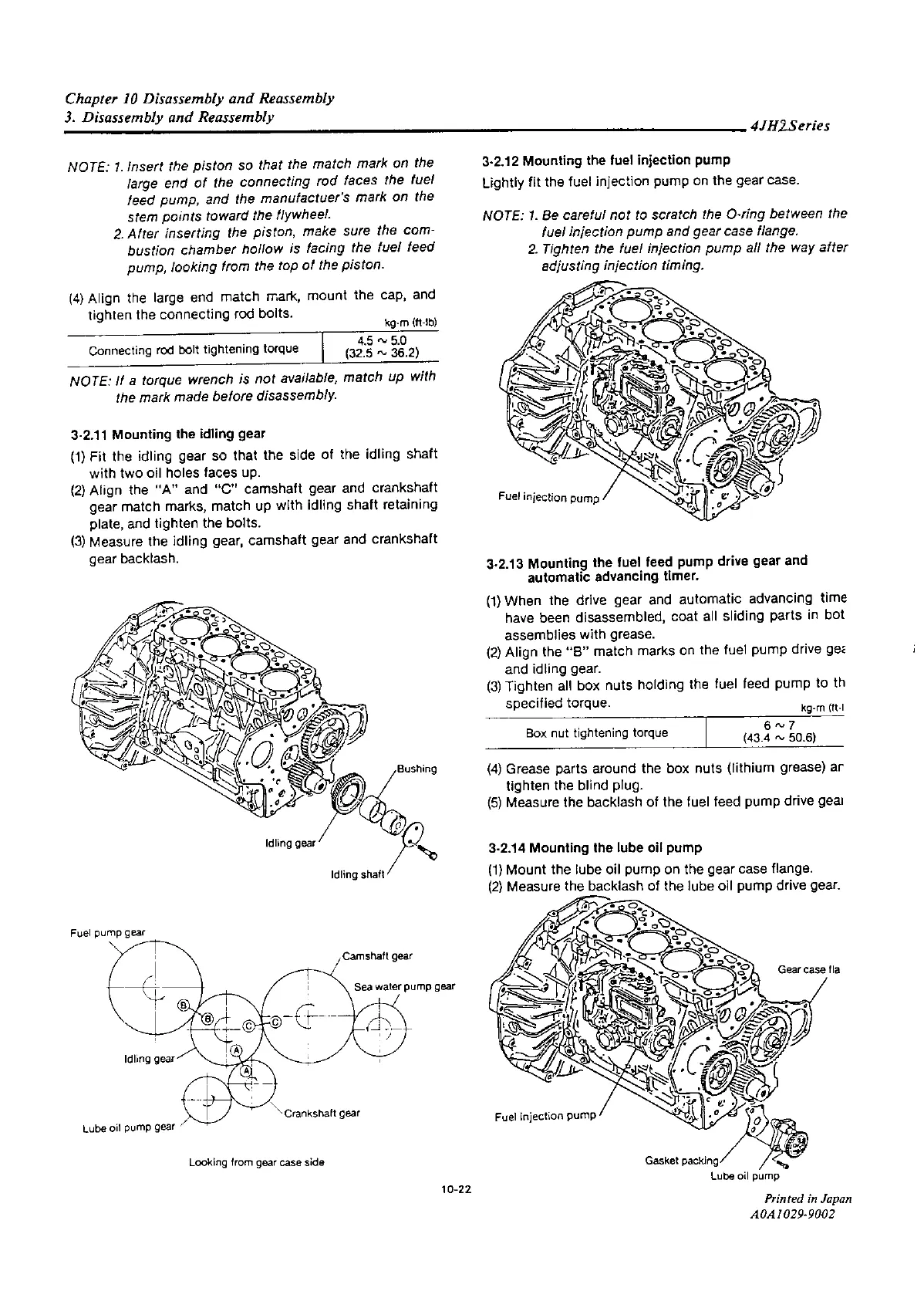Yanmar 4JH2-TE - Mounting the Idling Gear; Mounting the Fuel Injection;Lube Oil Pump; Mounting the Fuel Feed Pump Drive Gear and Automatic Advancing Timer