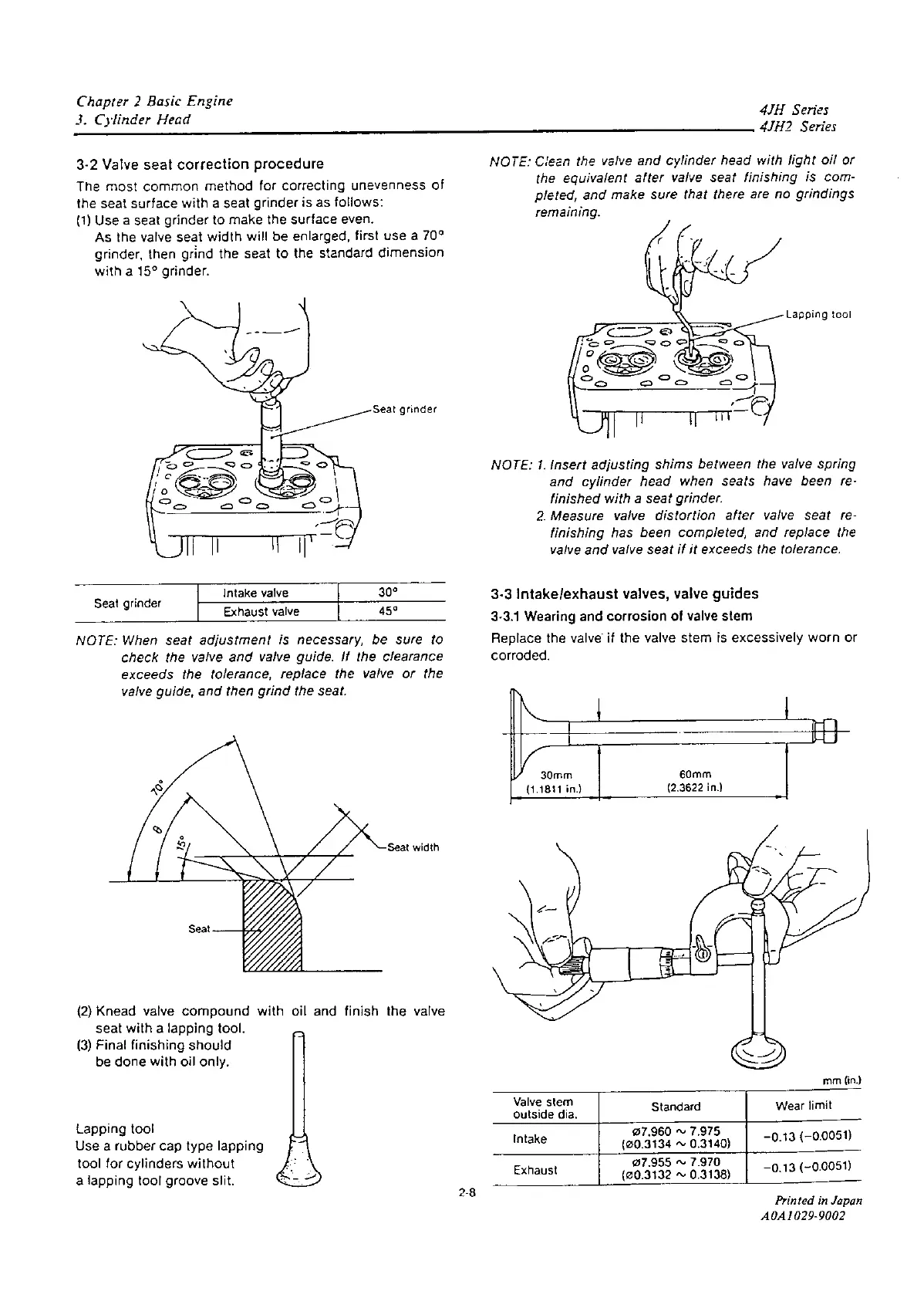 Yanmar 4JH2-TE - Valve Seat Correction Procedure; Wearing and Corrosion of Valve Stem