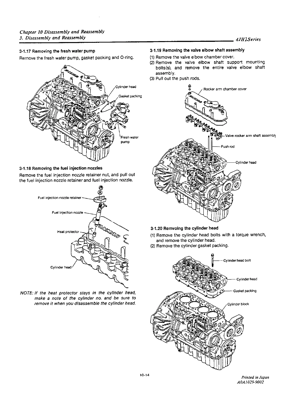 Yanmar 4JH2E - Removing the Fresh Water Pump; Removing the Fuel Injection Nozzles; Removing the Valve Elbow Shaft Assembly; Removing the Cylinder Head