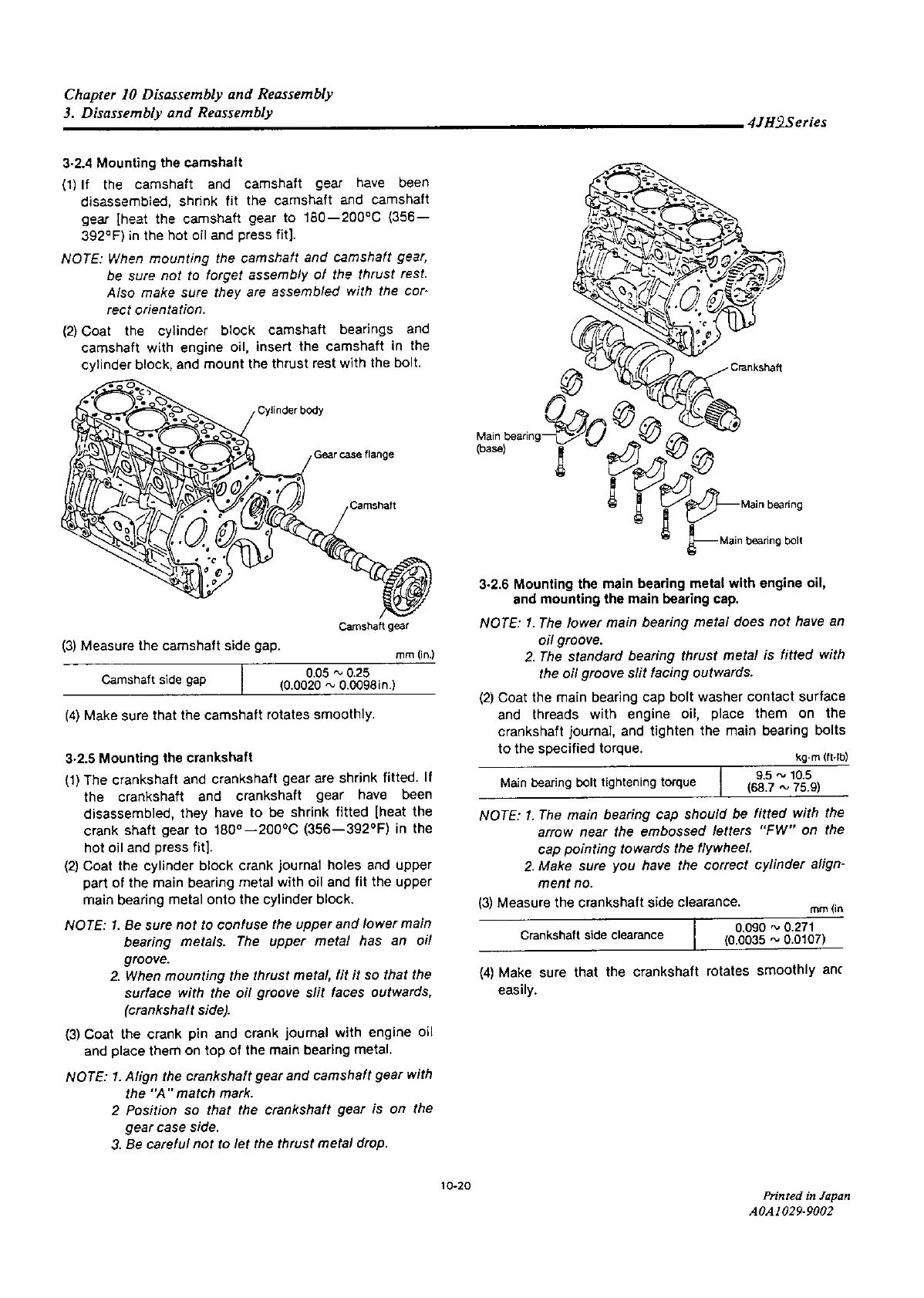 Yanmar 4JH2E - Mounting the Camshaft;Crankshaft; Mounting the Main Bearing Metal with Engine Oil, and Mounting the Main Bearing Cap