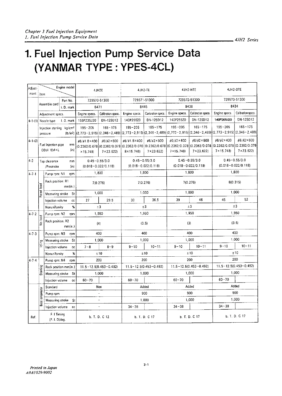 Yanmar 4JH2E - Fuel Injection Pump Service Data
