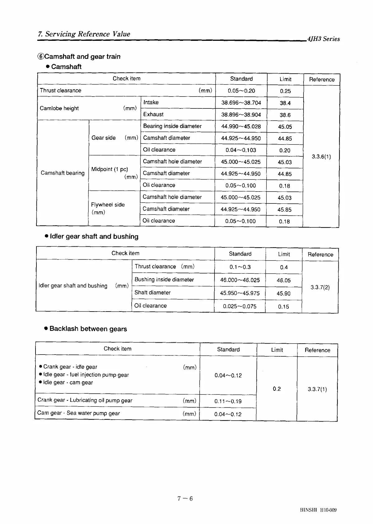 Yanmar 4JH3-DTE - Camshaft Service Standards; Idler Gear Shaft and Bushing Service Standards; Backlash between Gears Service Standards