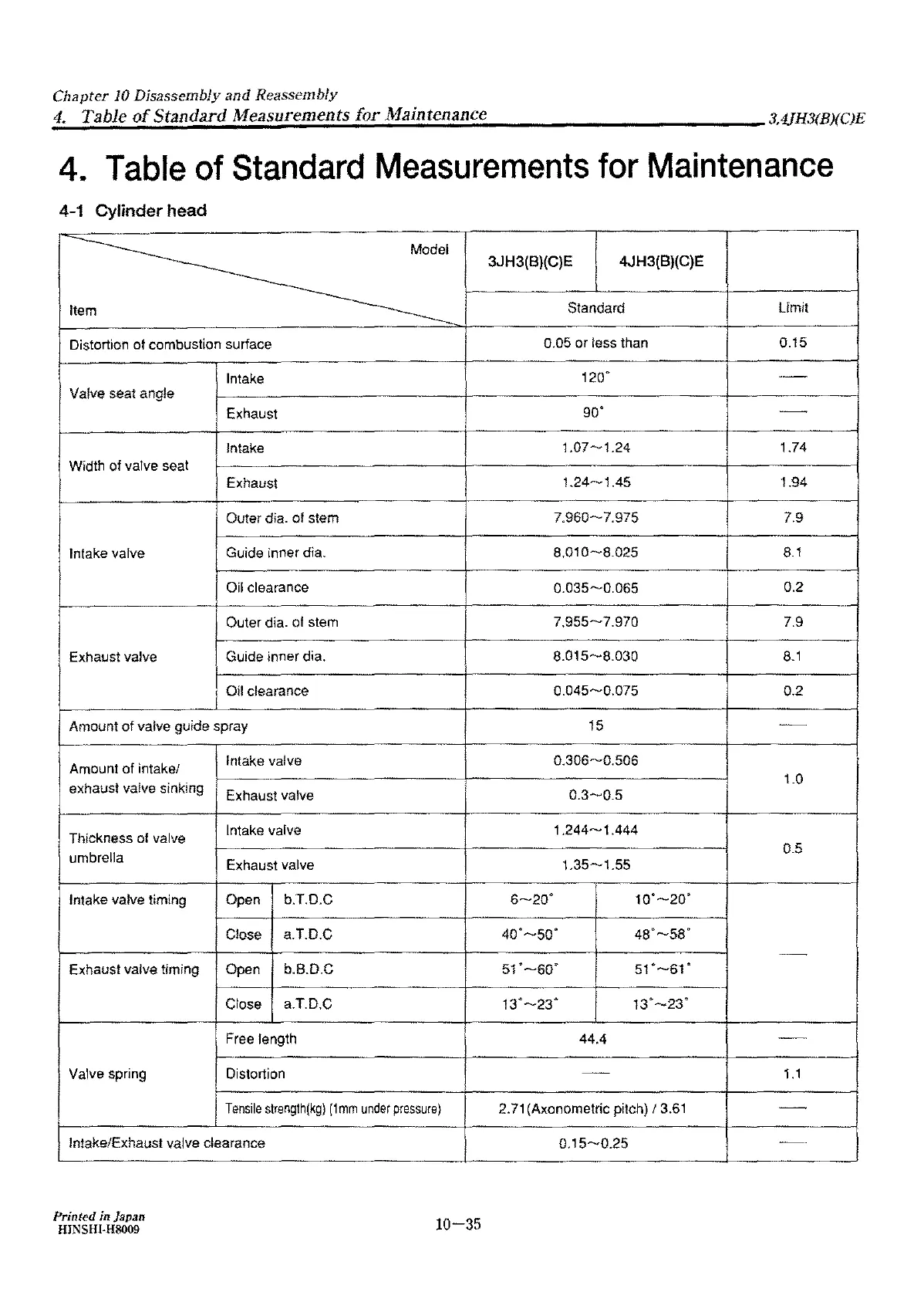 Yanmar 4JH3BE - 4. Table of Standard Measurements for Maintenance