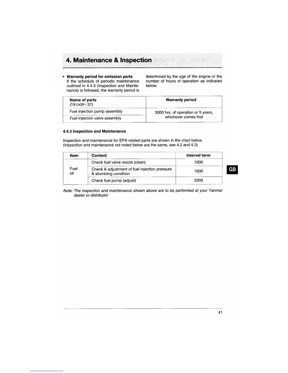 Yanmar 4JH3CE - Warranty Period for Emission Parts; Inspection and Maintenance for EPA Related Parts