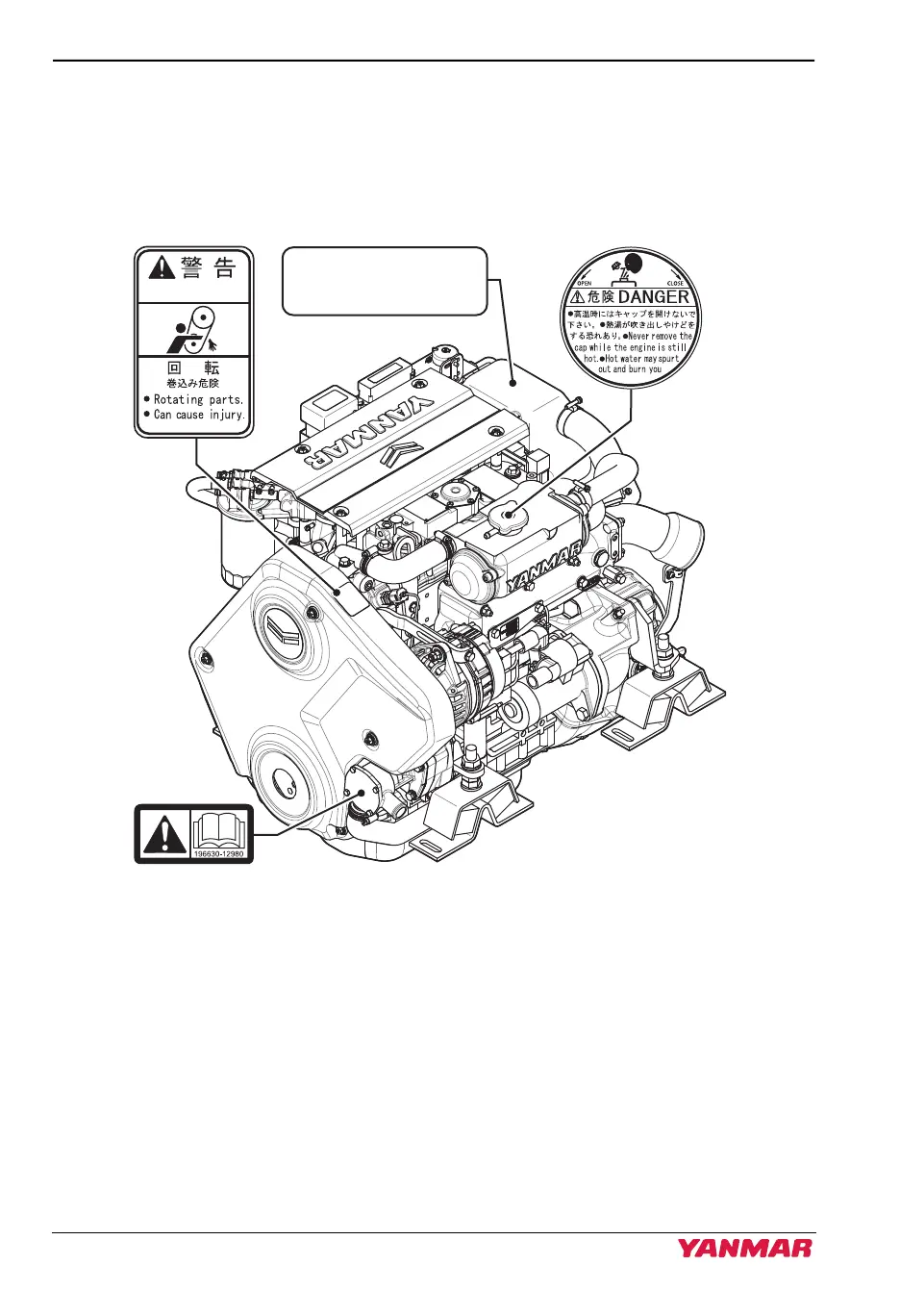 Figure 1, Figure 2 and Figure 3 show the location of safety decals on YANMAR 3JH40,