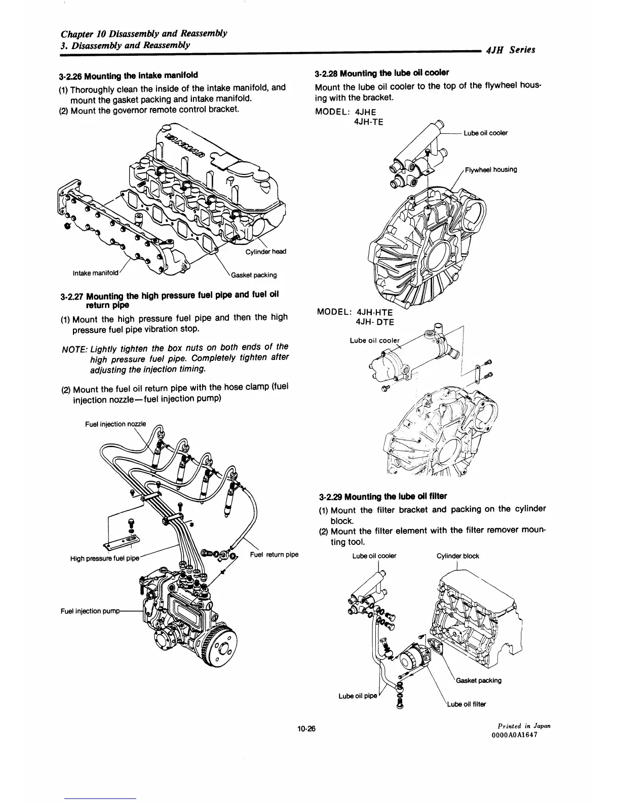 Yanmar 4JHE - Reassembly: Mounting the Intake Manifold; Reassembly: Mounting the Lube Oil Cooler; Reassembly: Mounting the High Pressure Fuel Pipe and Fuel Oil Return Pipe; Reassembly: Mounting the Lube Oil Filter