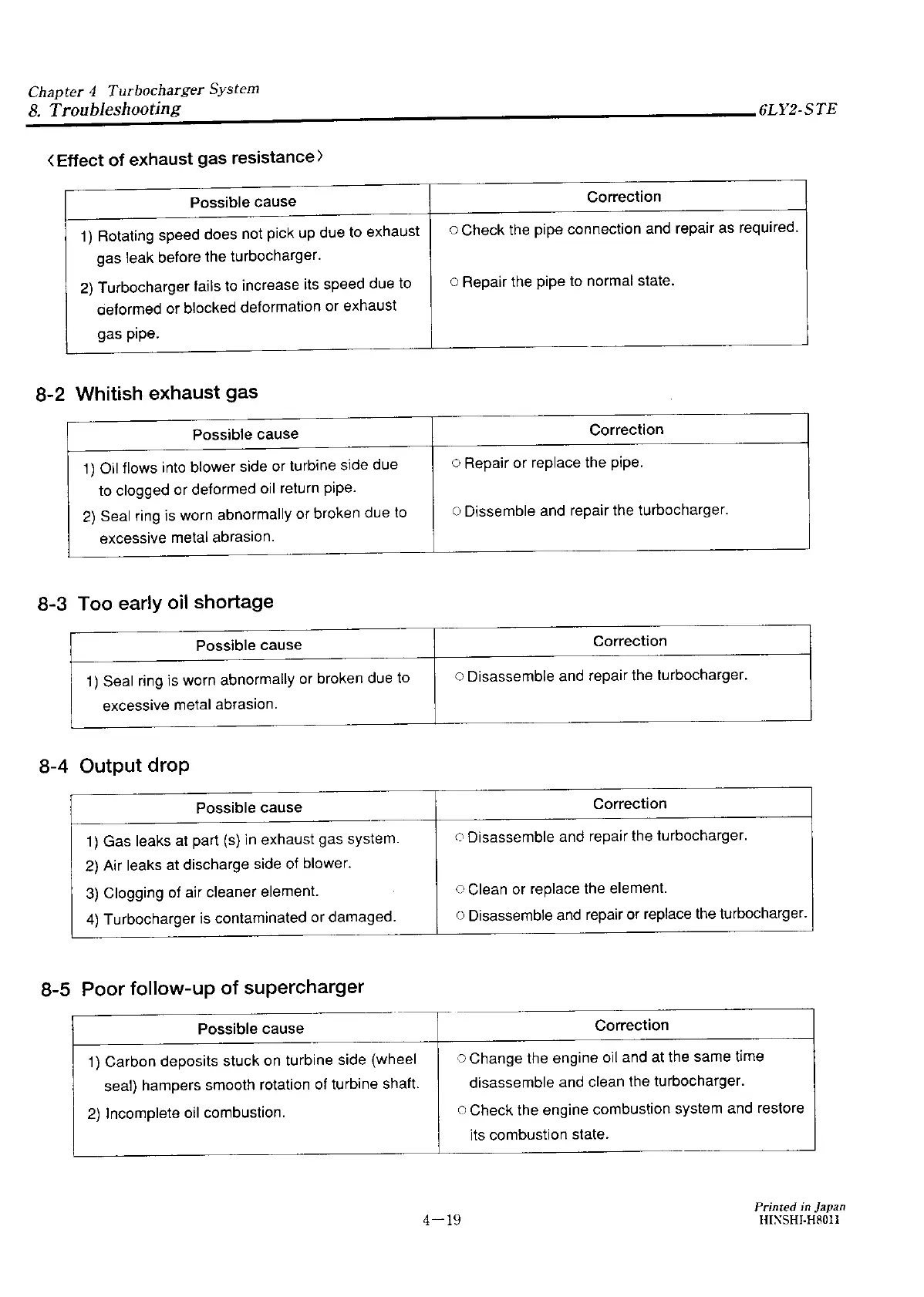 Yanmar 6LY2-STE - Whitish Exhaust Gas; Too Early Oil Shortage; Output Drop; Poor Follow-Up of Supercharger