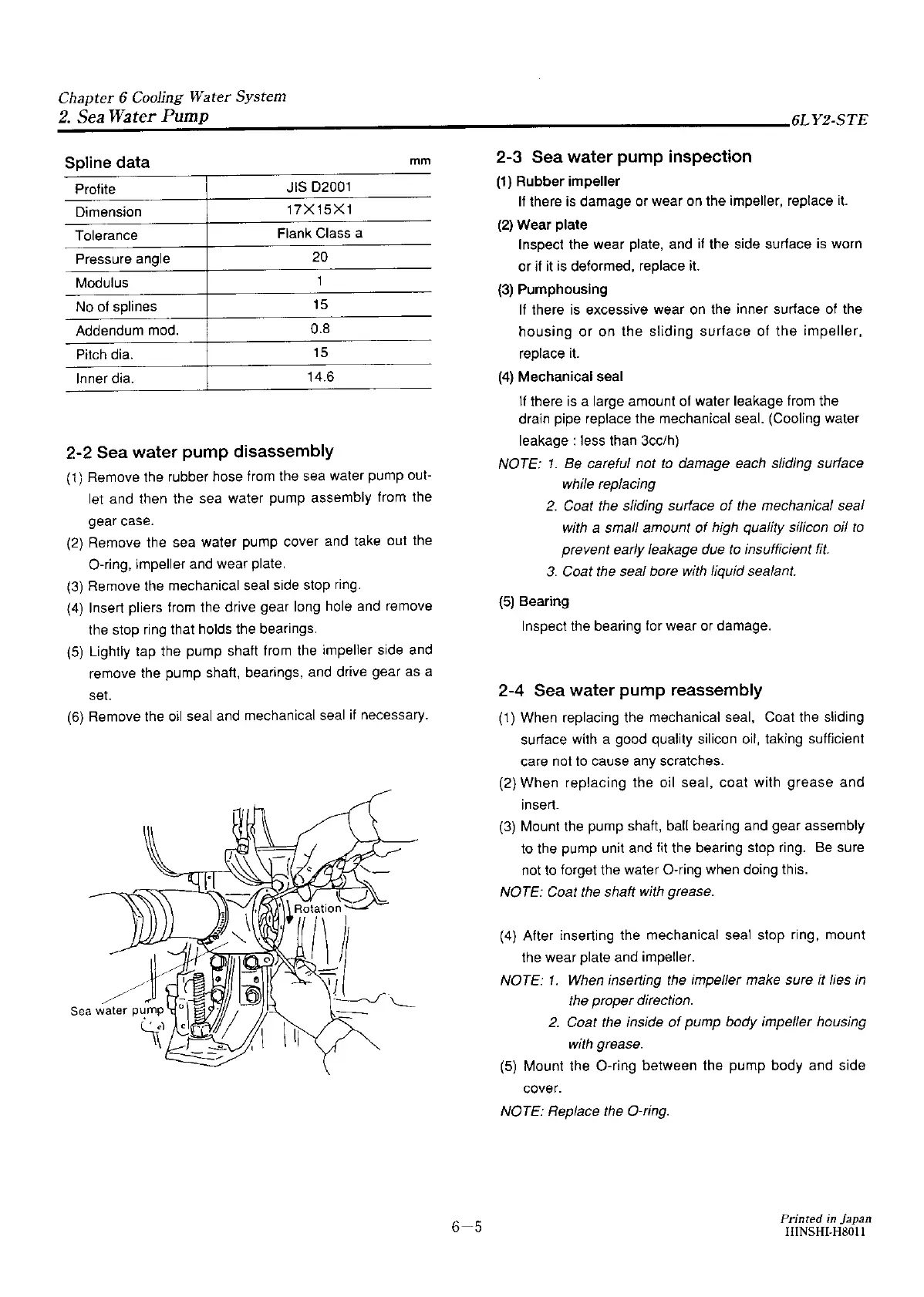 Yanmar 6LY2-STE - Sea Water Pump Disassembly; Sea Water Pump Inspection; Sea Water Pump Reassembly