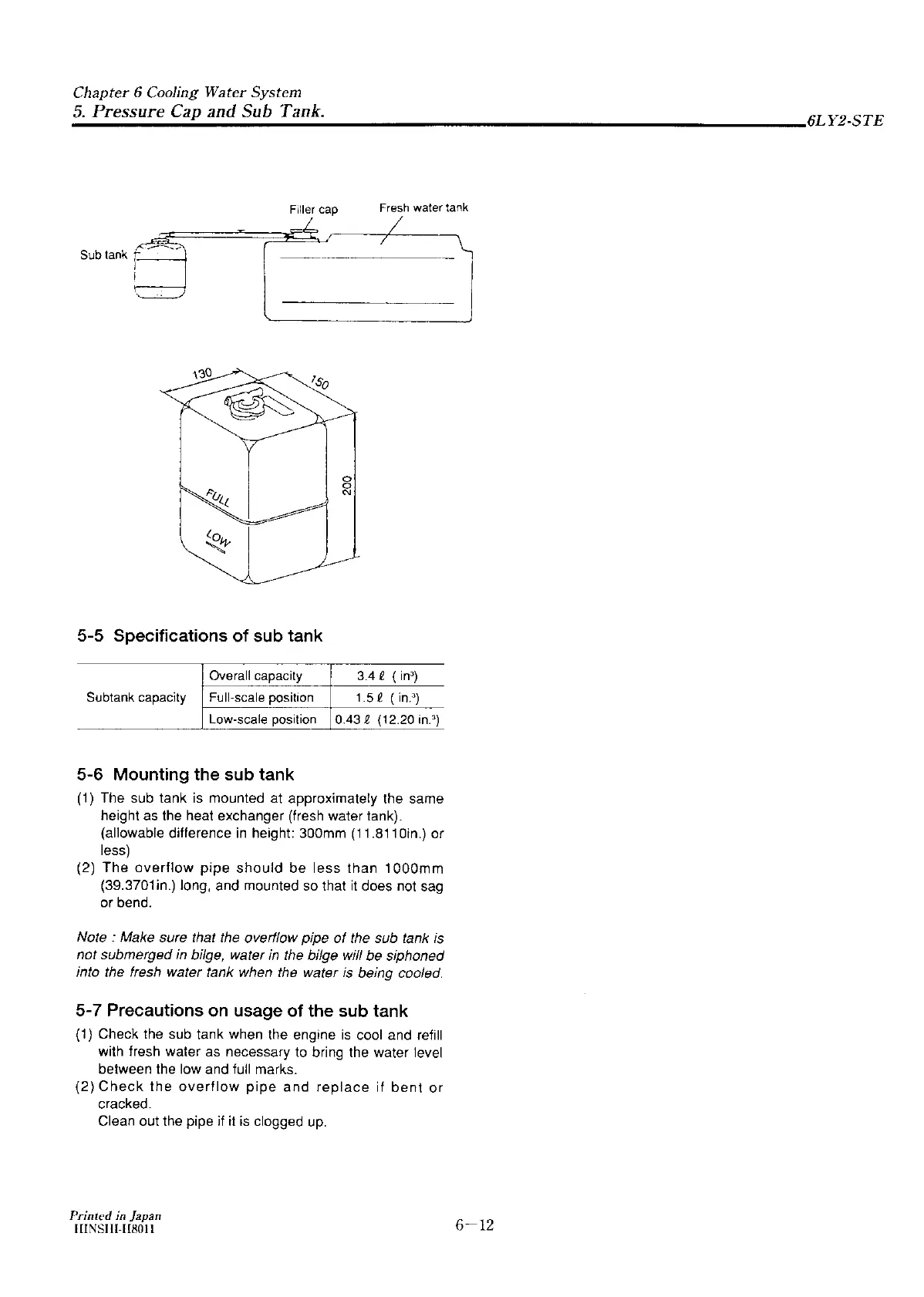 Yanmar 6LY2-STE - Specifications of Sub Tank; Mounting the Sub Tank; Precautions on Usage of the Sub Tank