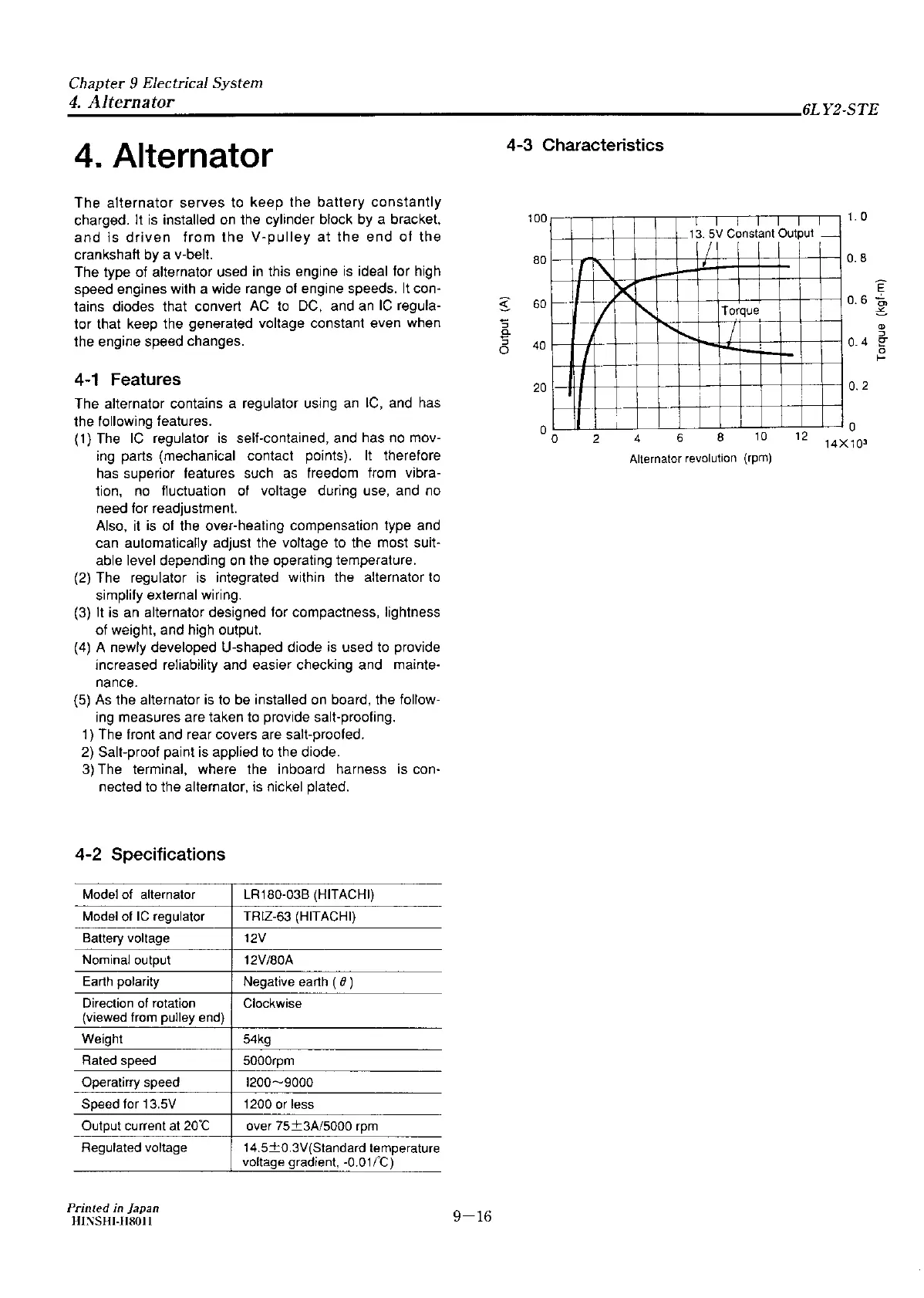 Yanmar 6LY2-STE - Alternator Features; Alternator Specifications; Alternator Characteristics
