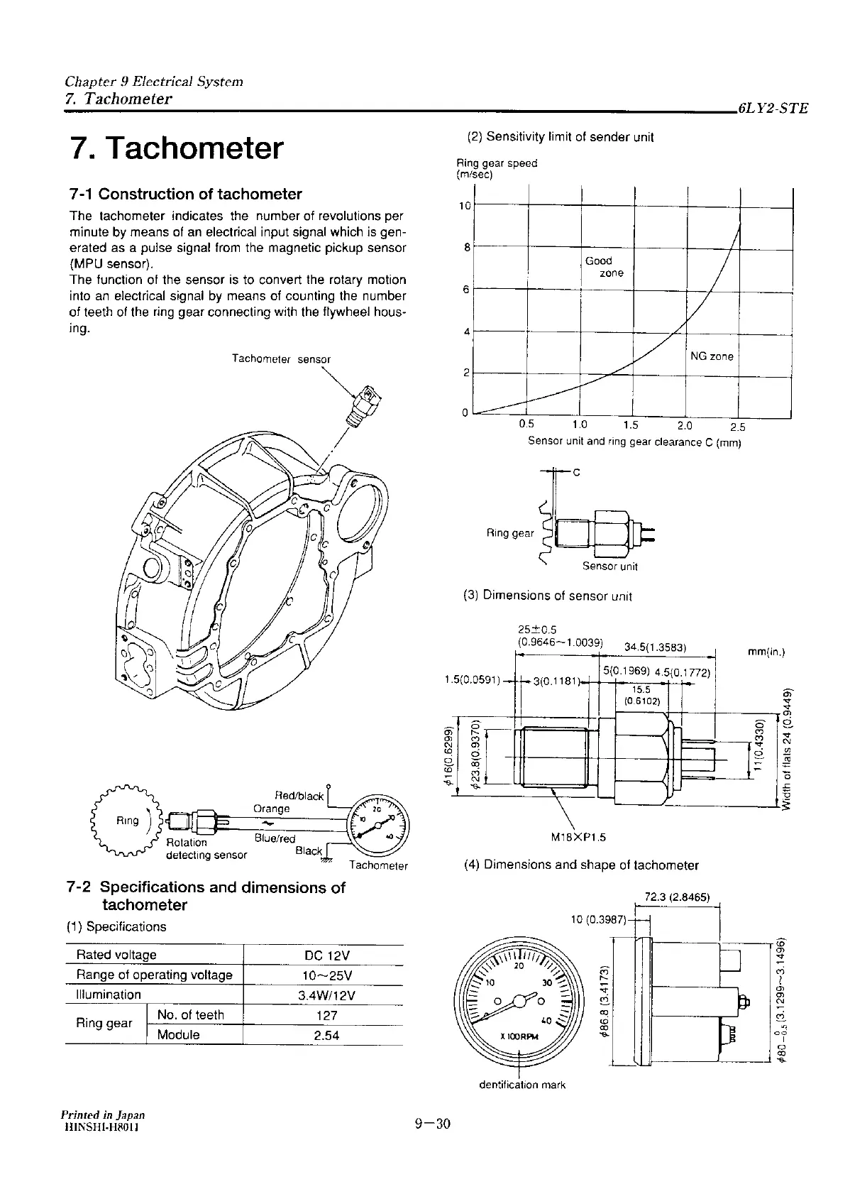 Yanmar 6LY2-STE - Tachometer; Specifications and Dimensions of Tachometer