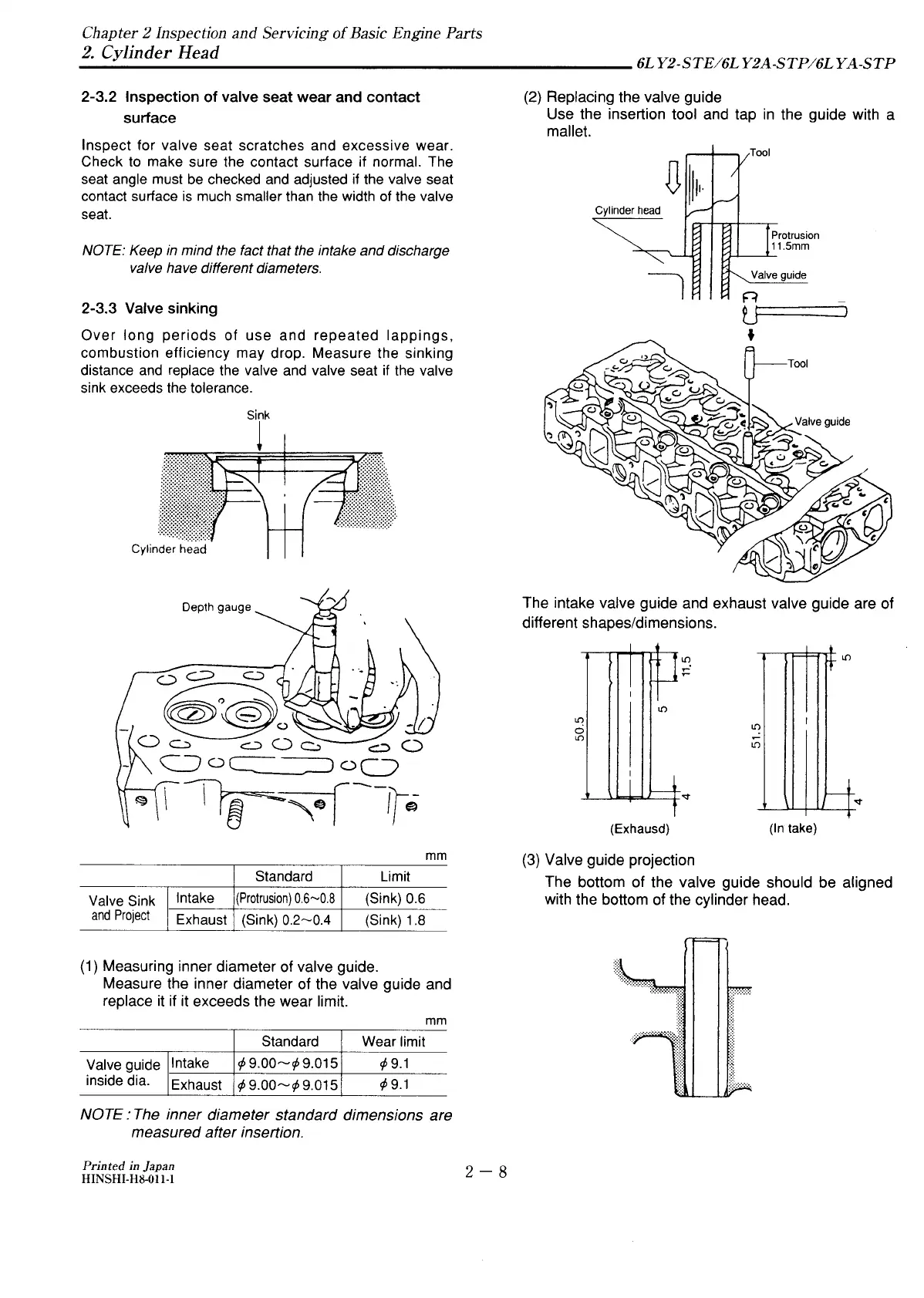 Yanmar 6LY2-STE - Inspection of Valve Seat Wear and Contact Surface; Valve Sinking