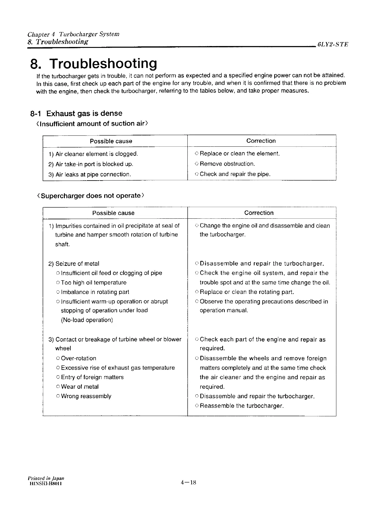 Yanmar 6LY2A-STP - Troubleshooting; Exhaust Gas Is Dense