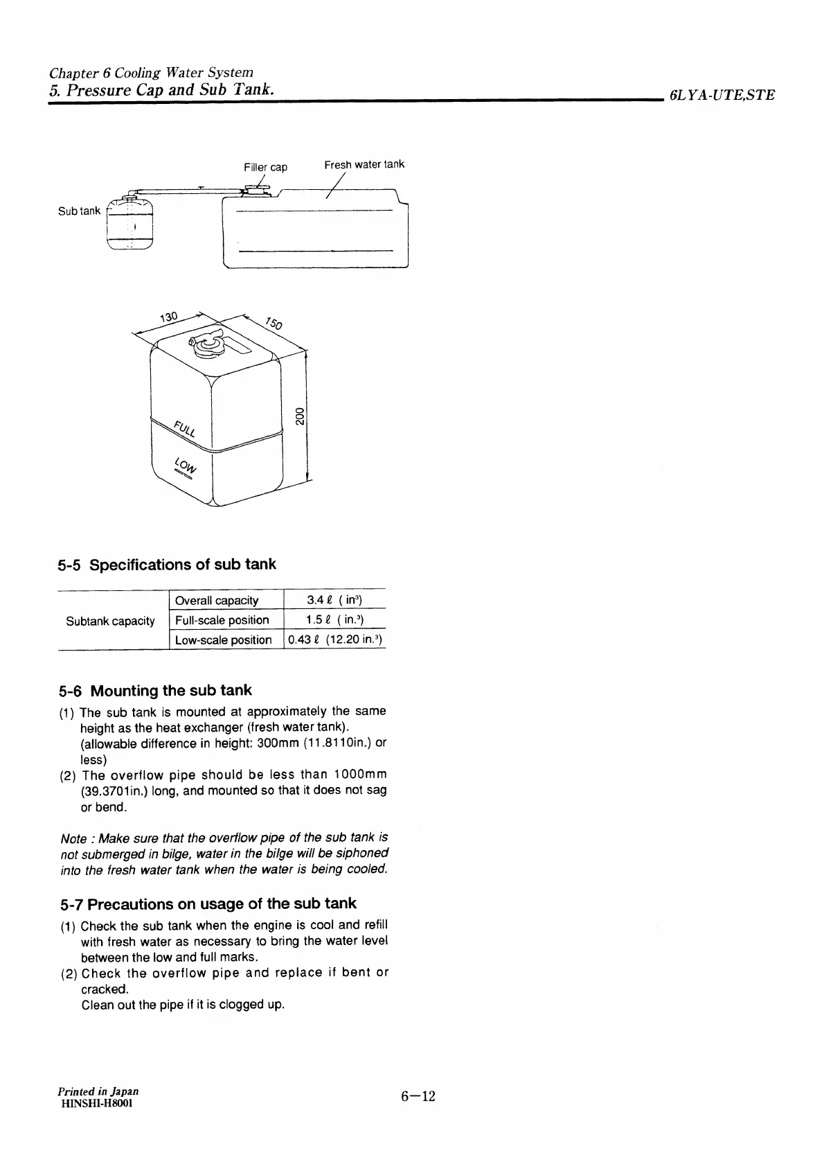Yanmar 6LYA-STE - Specifications of Sub Tank; Mounting the Sub Tank; Precautions on Usage of the Sub Tank