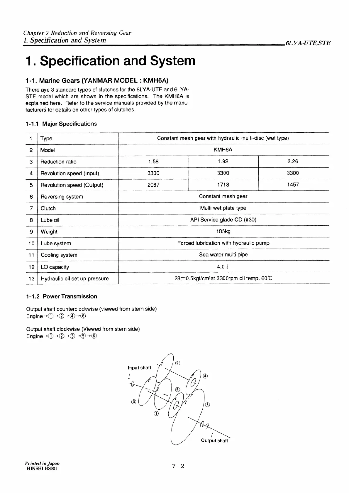 Yanmar 6LYA-STE - Reduction and Reversing Gear: Specification and System; Marine Gears (YANMAR MODEL: KMH6 A); Power Transmission