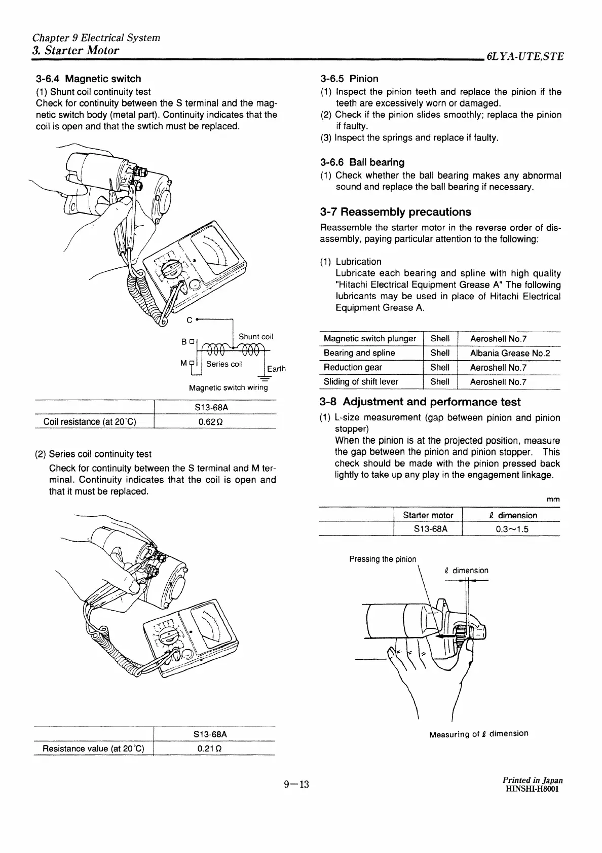 Yanmar 6LYA-STE - Magnetic Switch; Starter Motor Reassembly Precautions; Starter Motor Adjustment and Performance Test