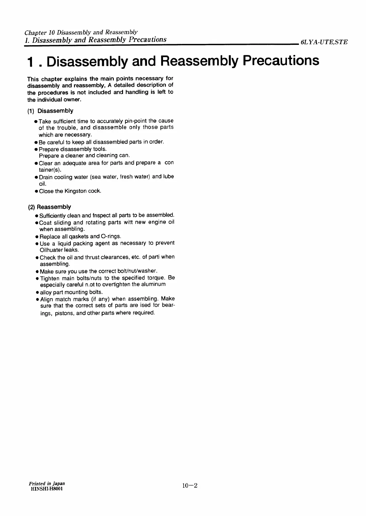Yanmar 6LYA-STE - Disassembly and Reassembly Precautions