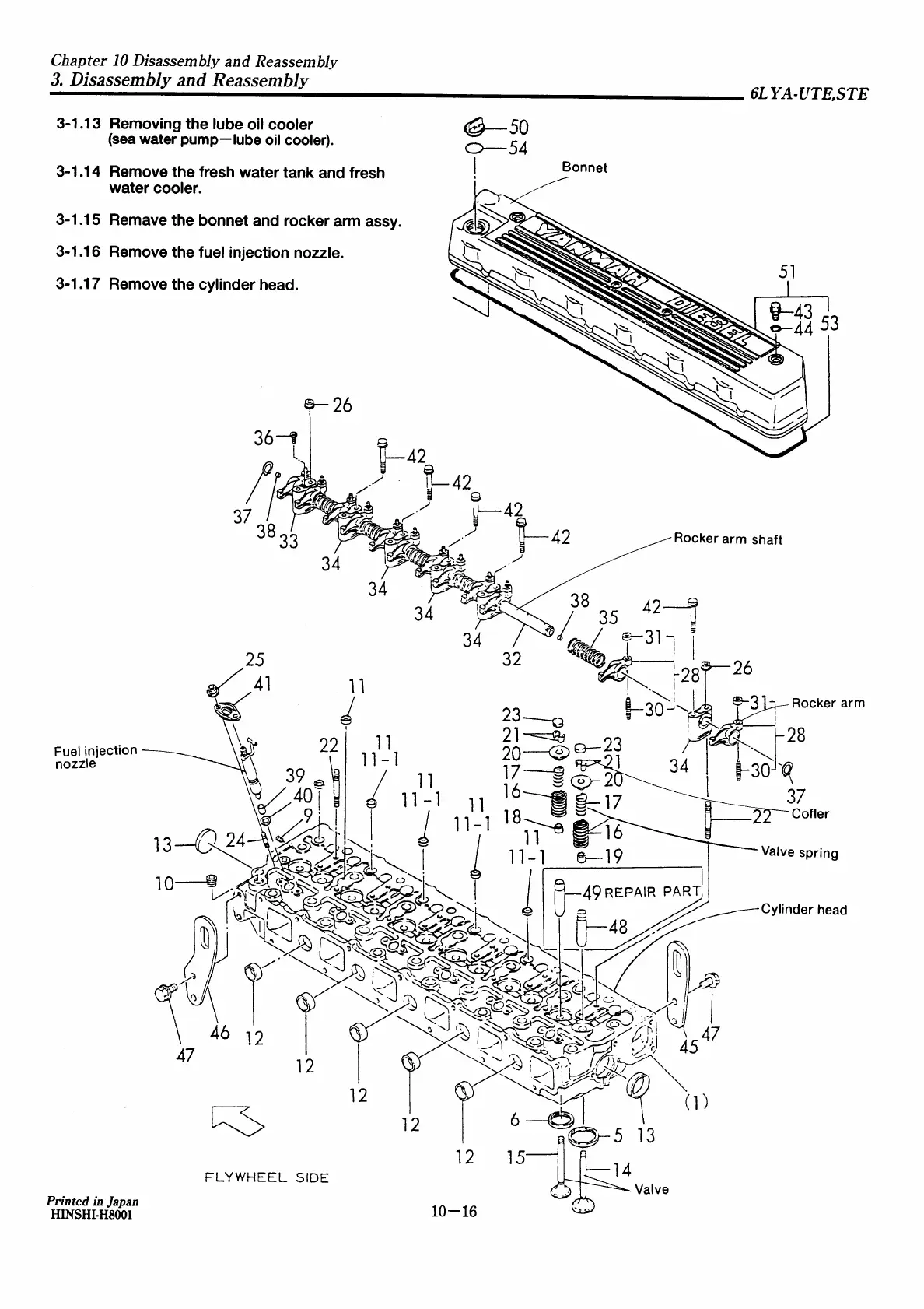 Yanmar 6LYA-STE - Removing the Lube Oil Cooler;Fresh Water Tank;Fresh Water Cooler; Removing the Bonnet and Rocker Arm Assy; Removing the Fuel Injection Nozzle; Removing the Cylinder Head