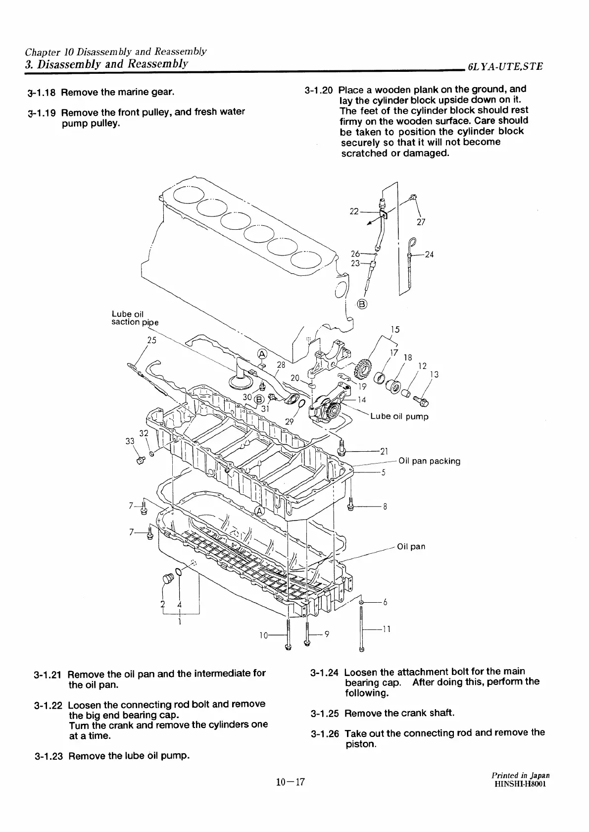 Yanmar 6LYA-STE - Removing the Marine Gear;Front Pulley;Fresh Water Pump Pulley; Removing the Oil Pan;Intermediate for the Oil Pan; Removing Lube Oil Pump; Removing the Crank Shaft