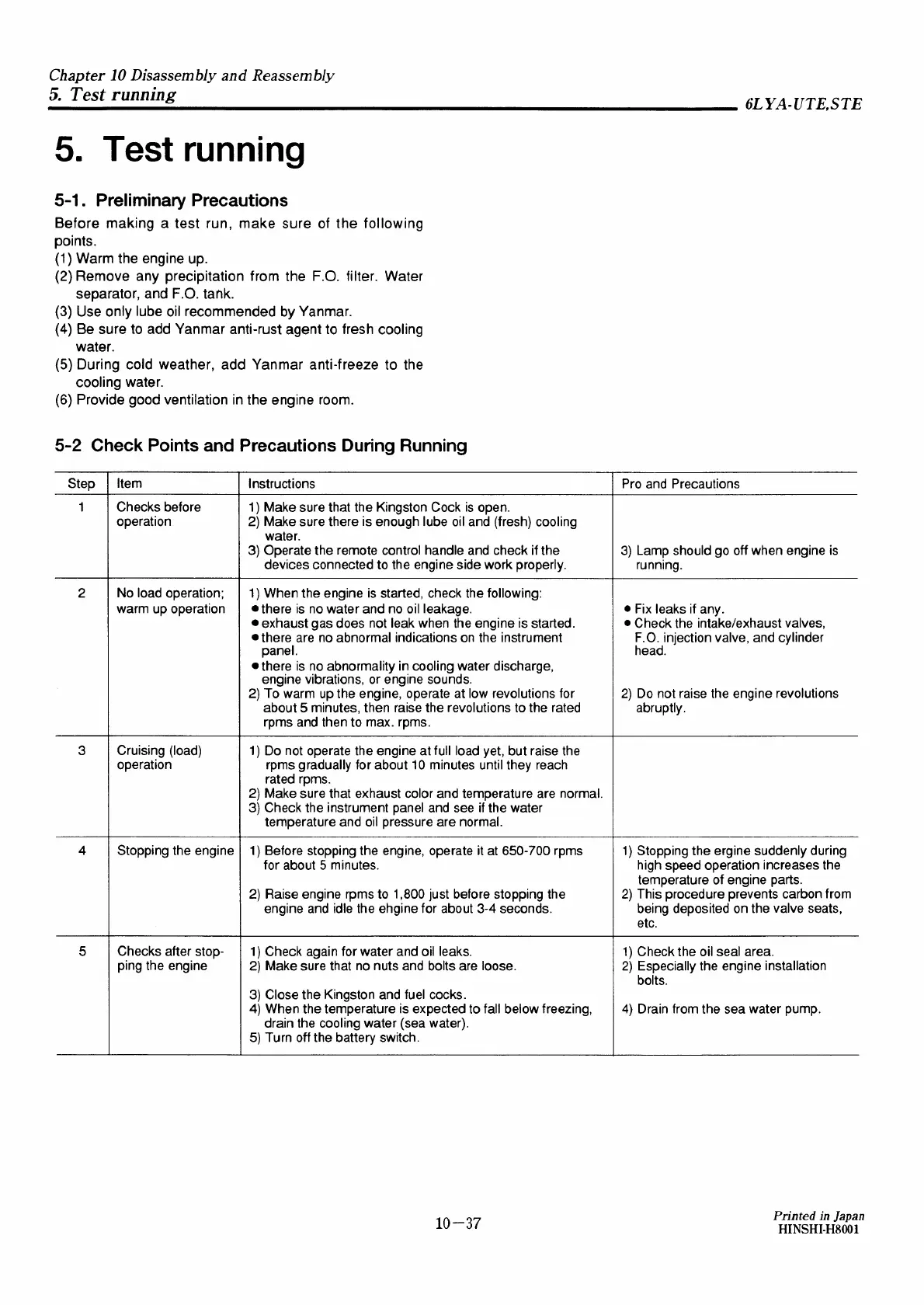 Yanmar 6LYA-STE - Test Running; Preliminary Precautions; Check Points and Precautions During Running