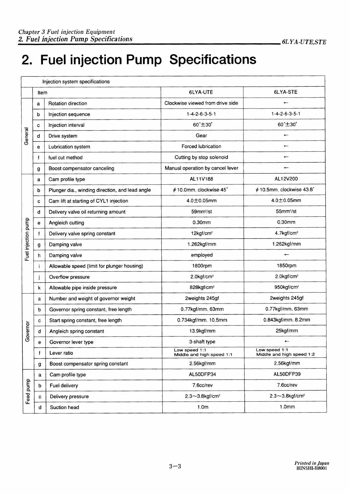 Yanmar 6LYA-STE - Fuel Injection Pump Specifications