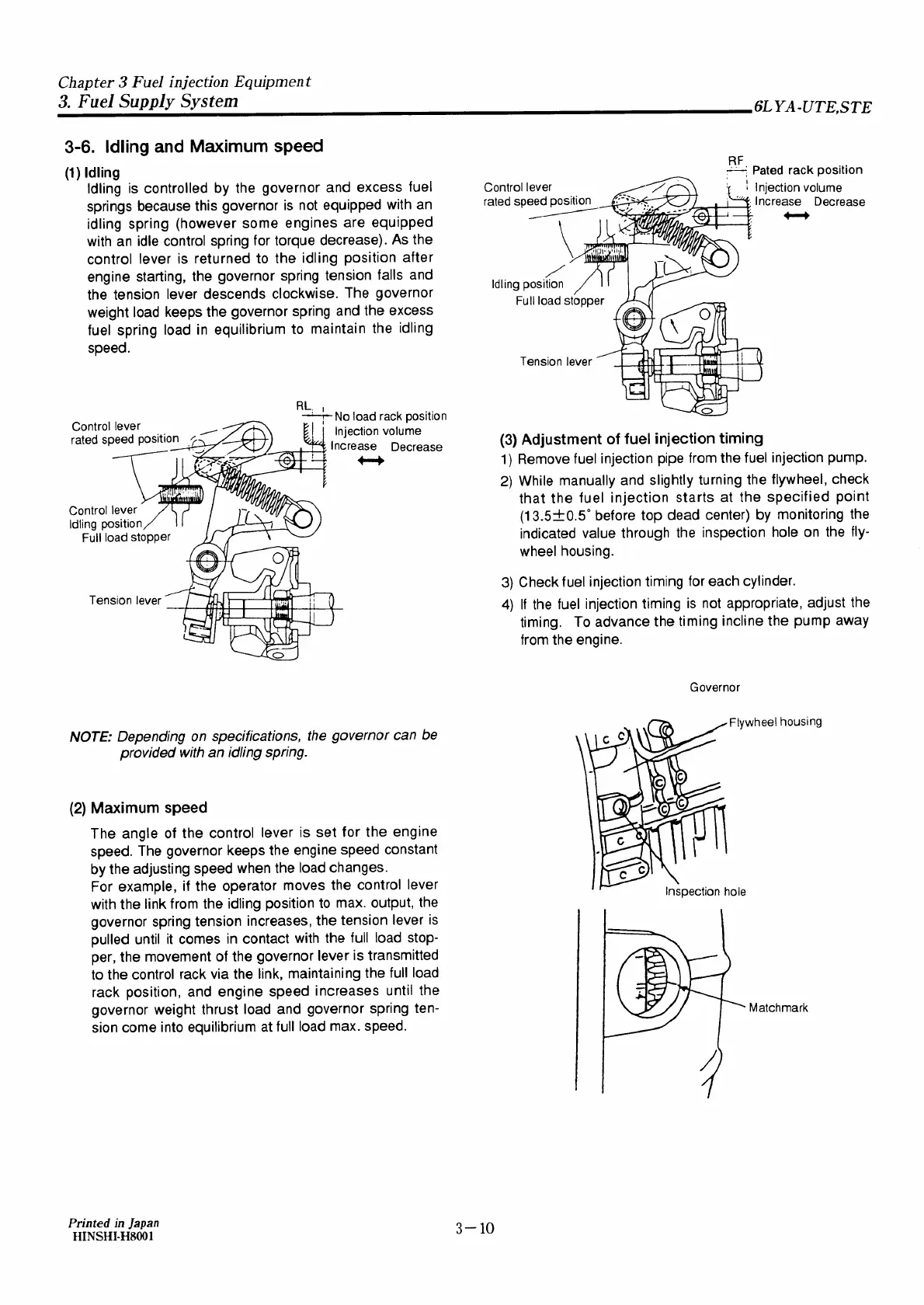 Yanmar 6LYA-STE - Idling and Maximum Speed; Adjustment of Fuel Injection Timing