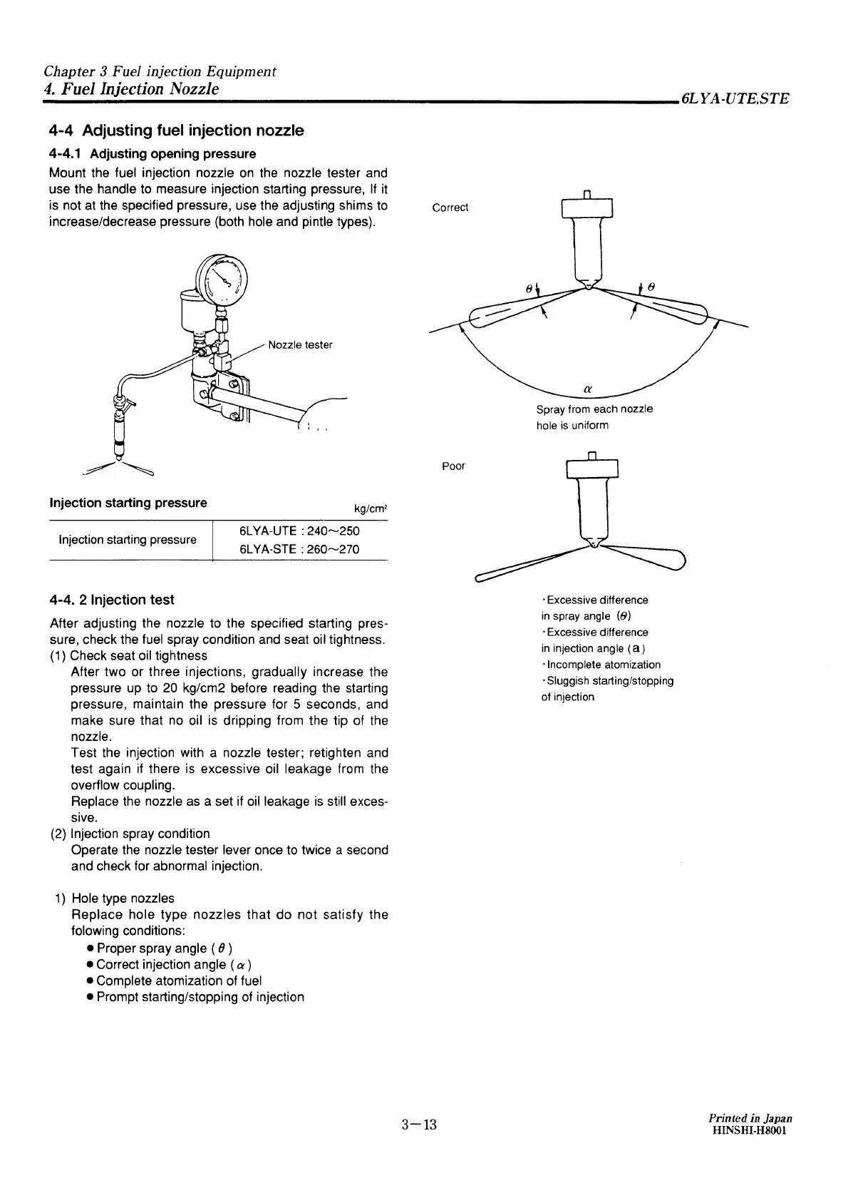 Yanmar 6LYA-STE - Adjusting Fuel Injection Nozzle; Adjusting Opening Pressure; Injection Test