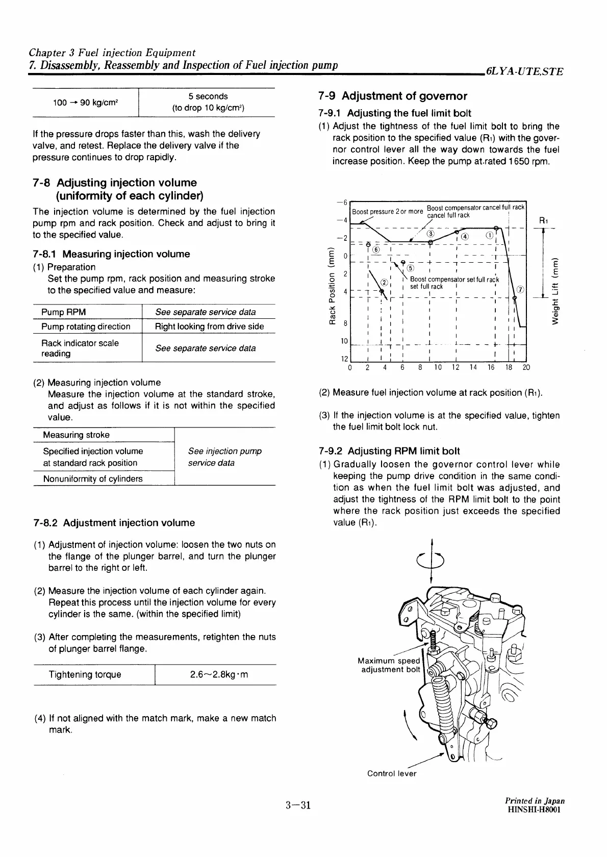 Yanmar 6LYA-STE - Adjusting Injection Volume (Uniformity of each Cylinder); Measuring Injection Volume; Adjustment of Governor; Adjusting the Fuel Limit Bolt;Rpm Limit Bolt
