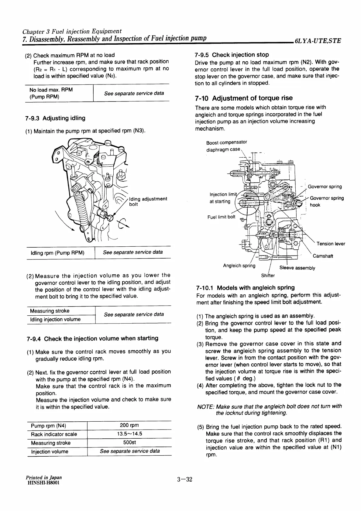 Yanmar 6LYA-STE - Check the Injection Volume When Starting; Adjustment of Torque Rise; Models with Angleich Spring