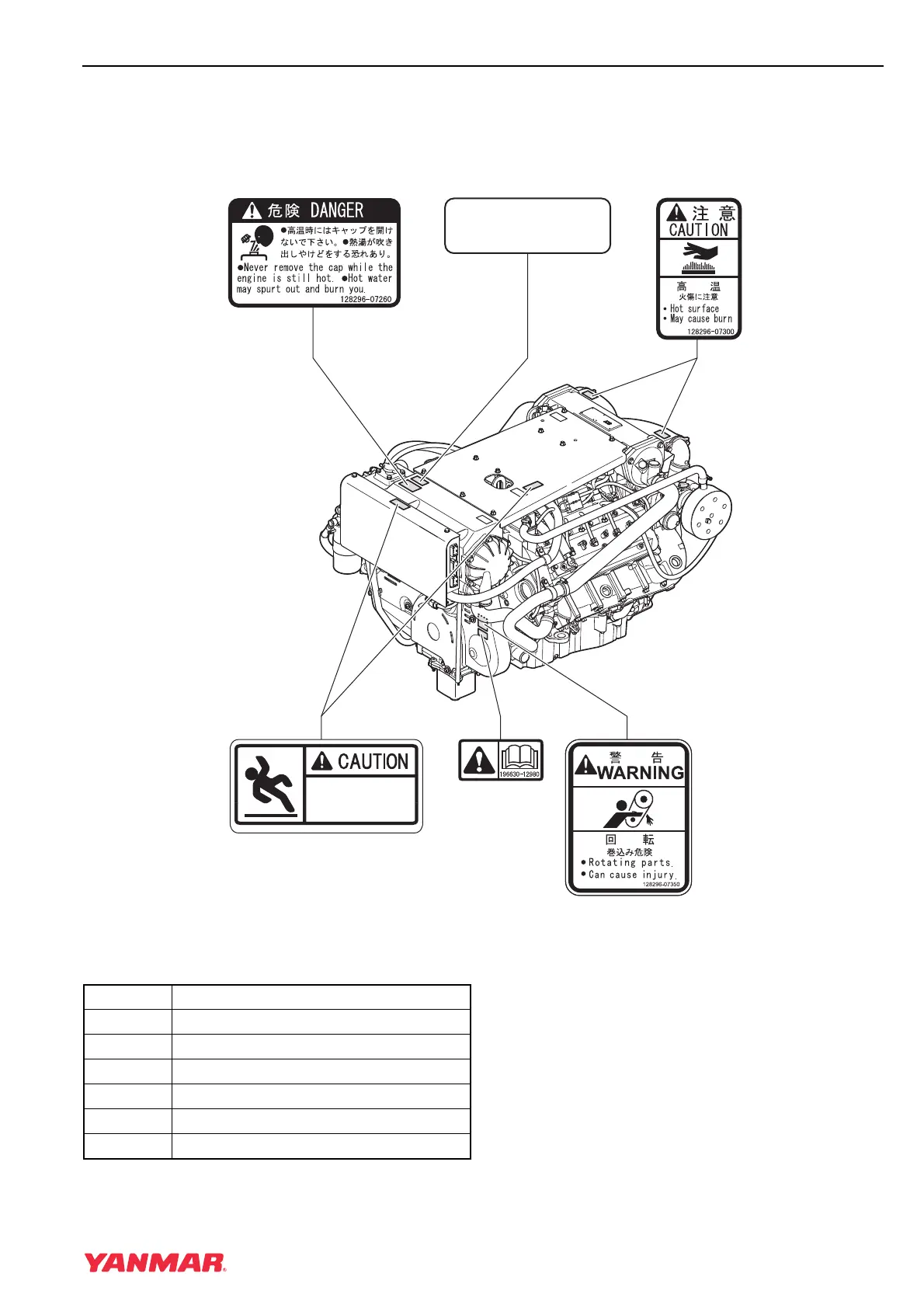 Figure 1 and Figure 2 show the location of safety decals on Yanmar 8LV series marine engines.