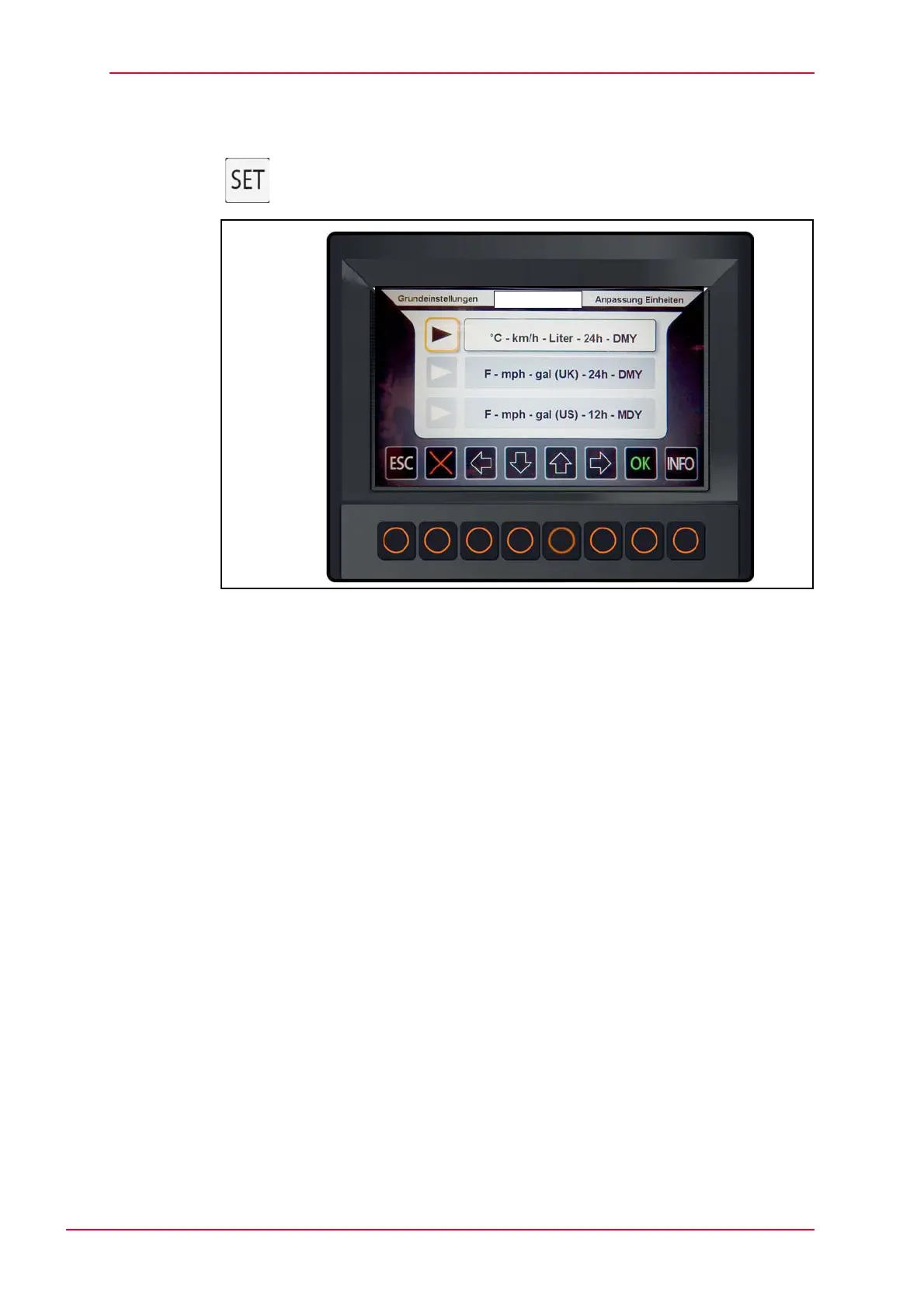 • Metric units: °C - km/h - liter - 24h - DMY