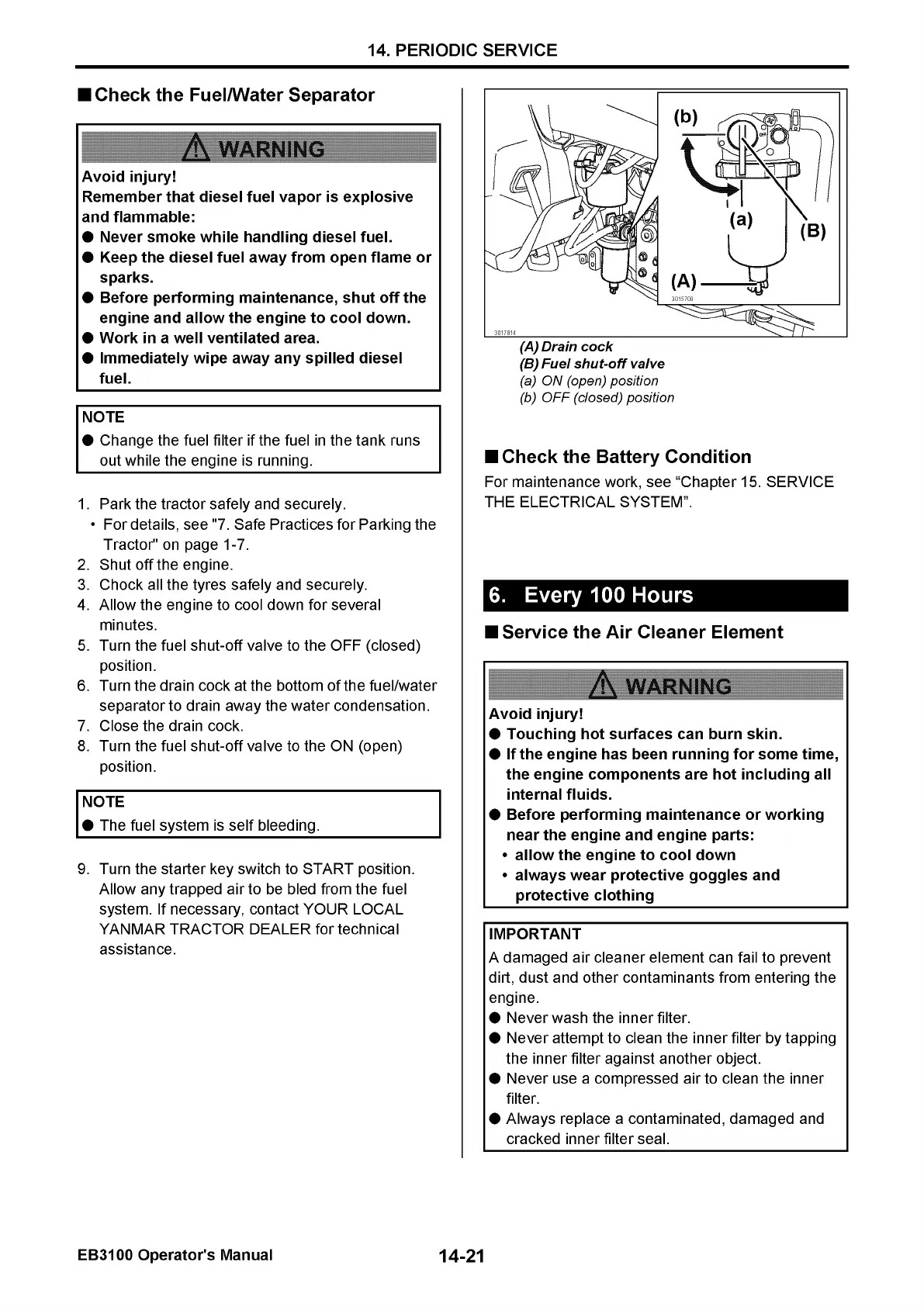Yanmar EB3100 - Check the Fuel;Water Separator; Check the Battery Condition; Every 100 Hours; Service the Air Cleaner Element