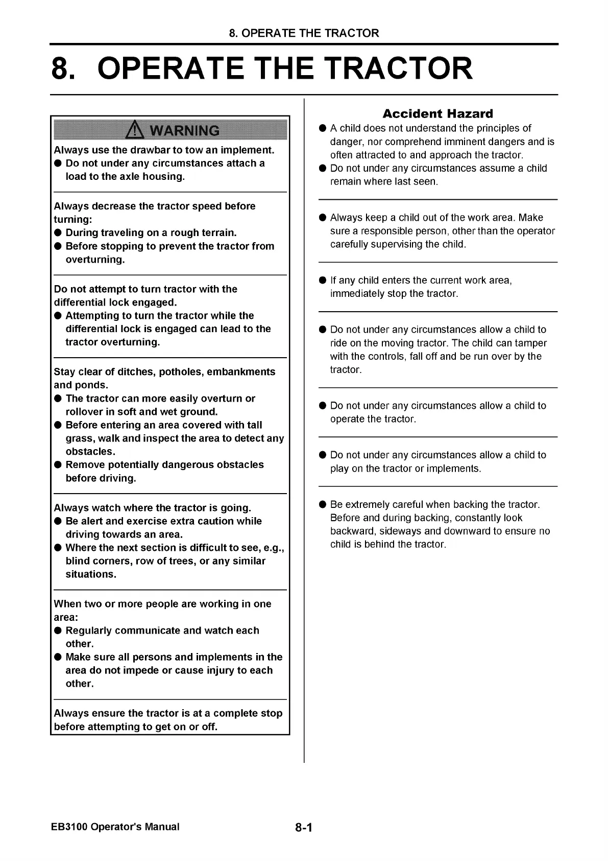 Yanmar EB3100 - 8. OPERATE THE TRACTOR; Accident Hazard